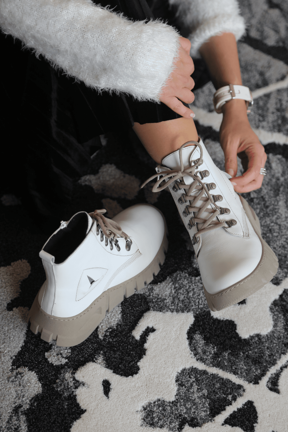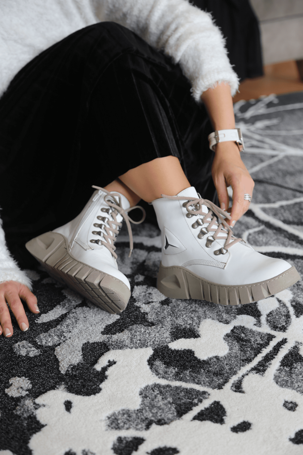Hakiki deri, Sıcak Keçe Astar, Çıkartılabilir Anatomik Doğal Latex Süed Fuspet, Termo Taban,Yan Fermuarlı, Patchwork Detaylı, Topuk yüksekliği 2cm.