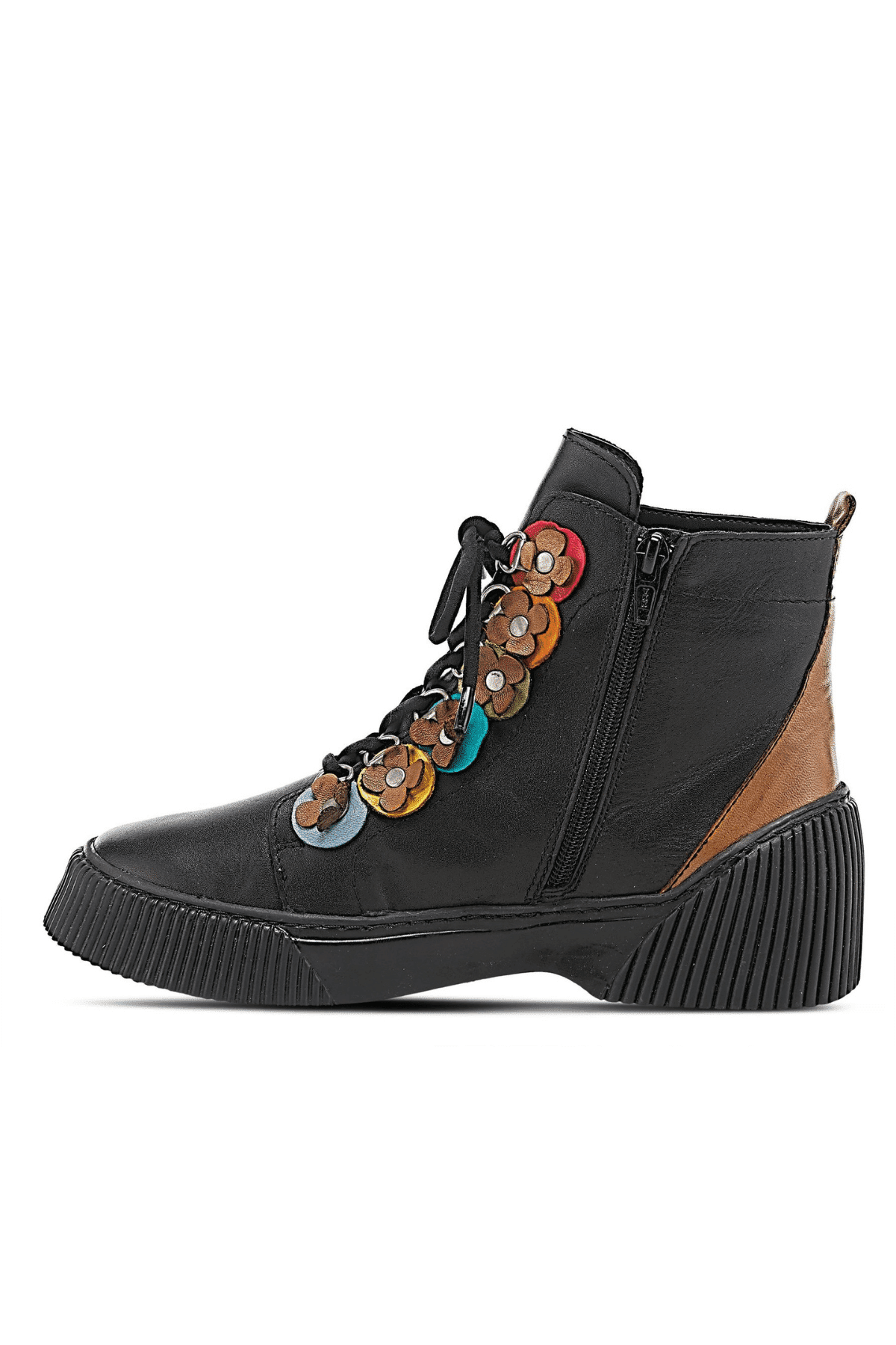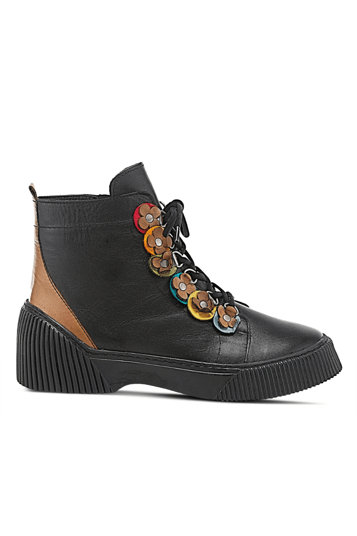 Hakiki deri, Sıcak Keçe Astar, Çıkartılabilir Anatomik Doğal Latex Süed Fuspet, Termo Taban,Yan fermuarlı, lastik bağcıklı, çiçek toka detaylı, Topuk yüksekliği 2cm.