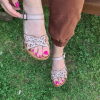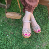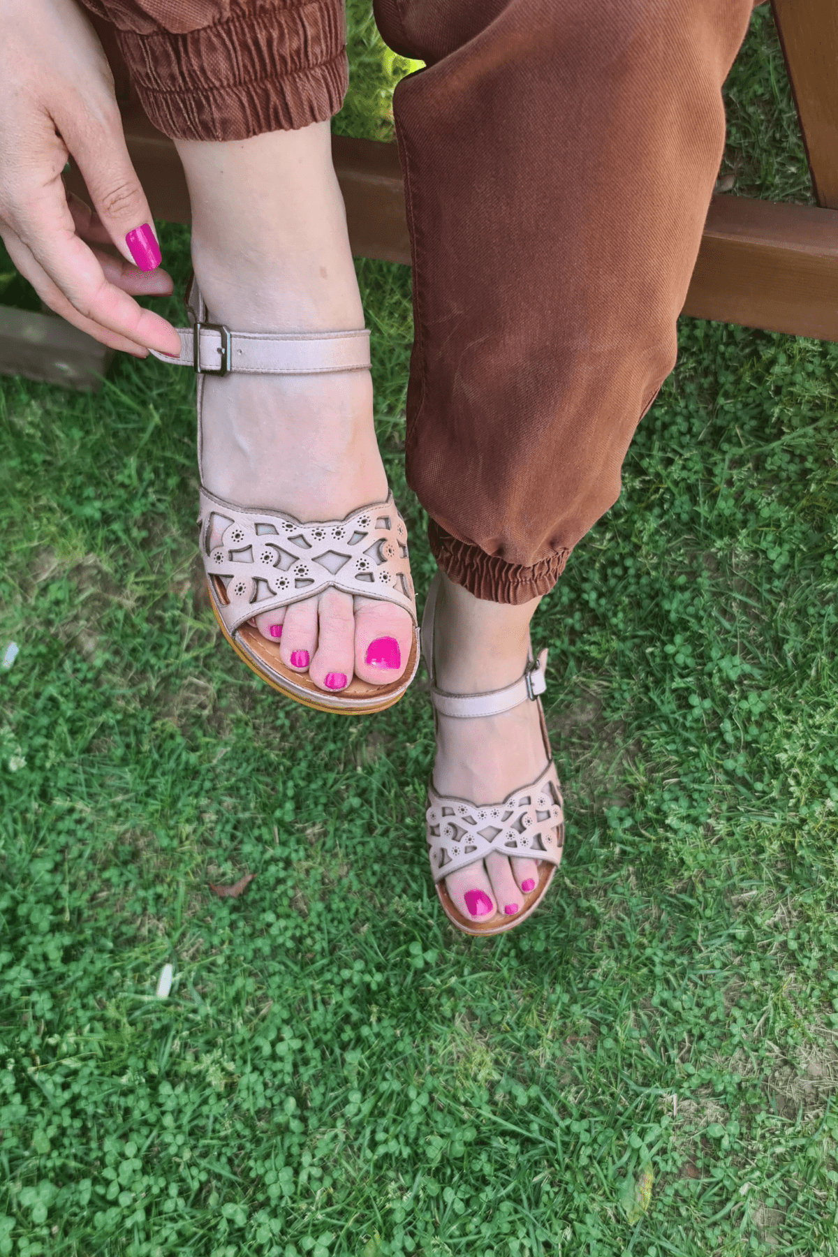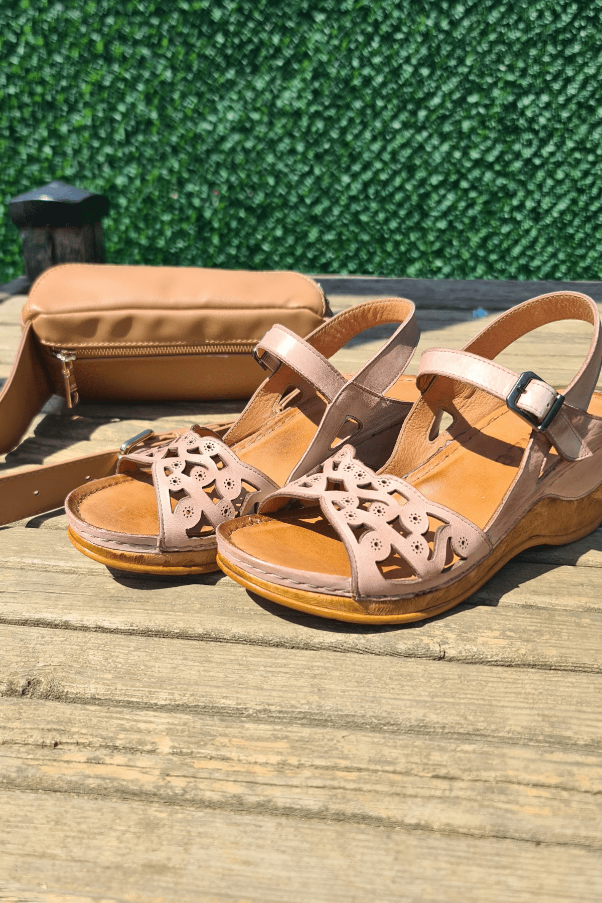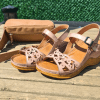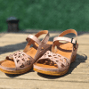 ÇOK BANTLI, İÇ DIŞ HAKİKİ DERİ, ARKA AYARLANABİLİR TOKALI,DESENLİ POLİÜRETAN MANTAR TABAN, DOLGU TOPUK.