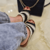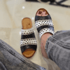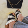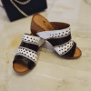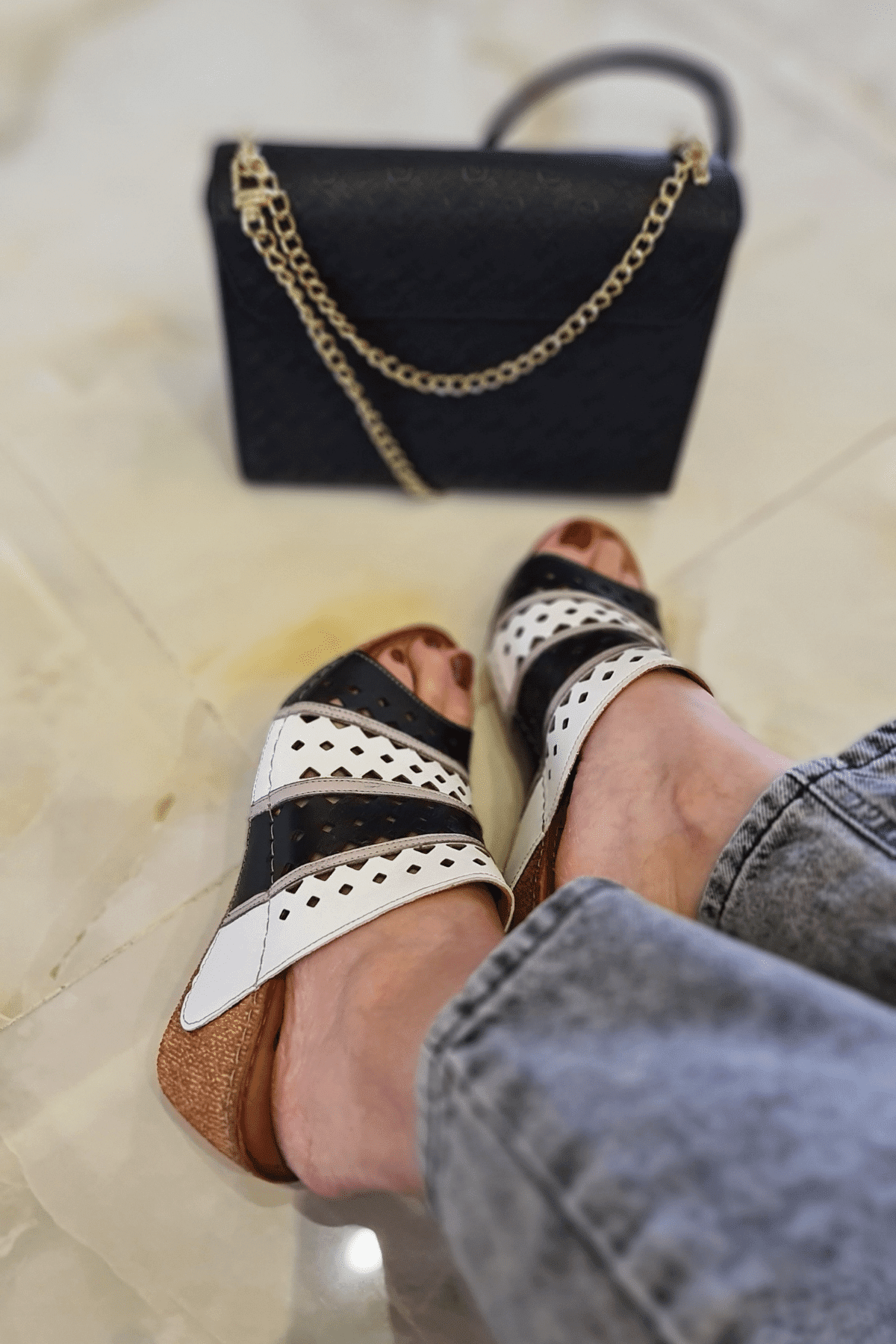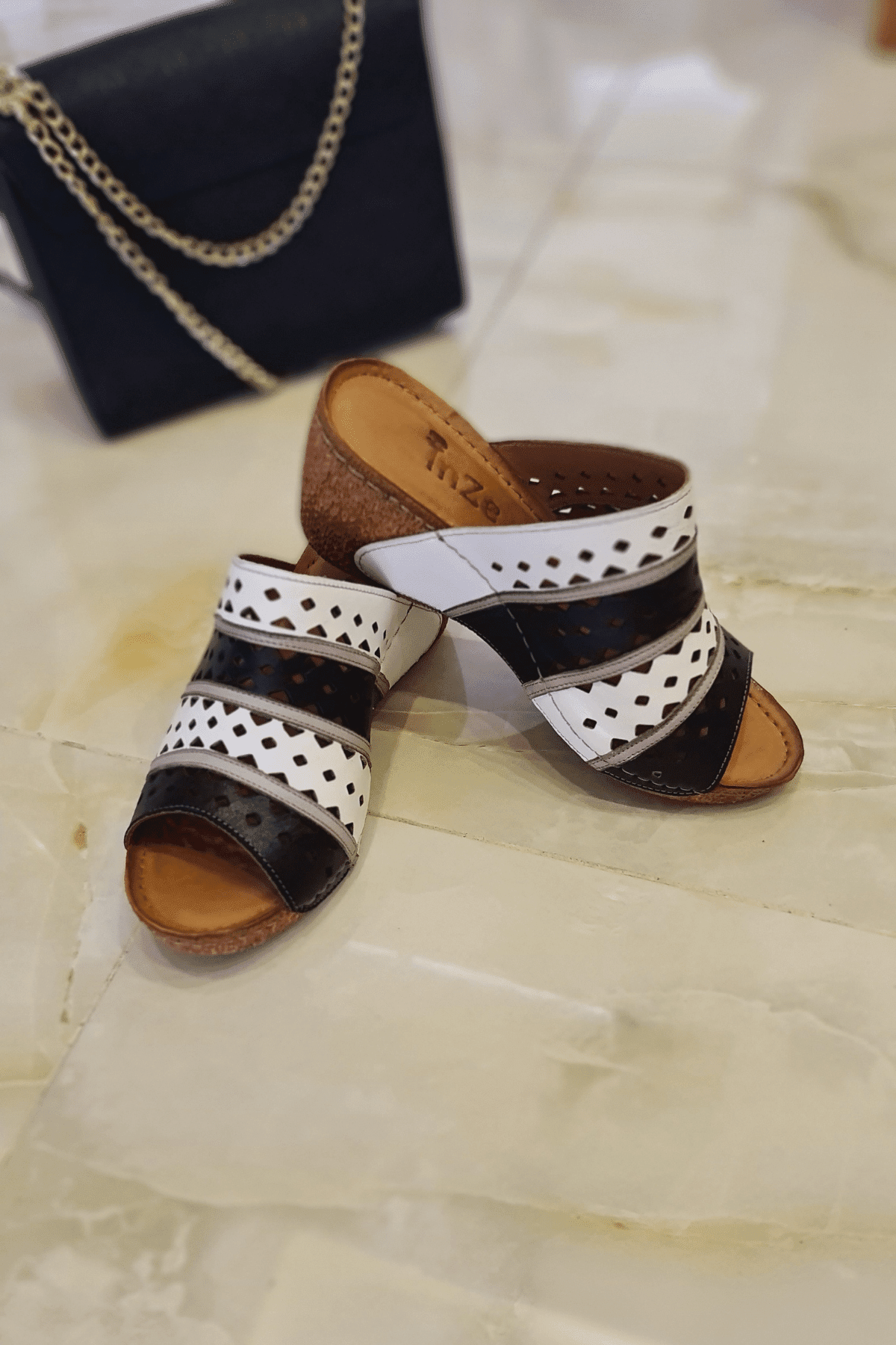 Çiçek detaylı, mantar poliüretan taban, iç dış hakiki deri.