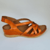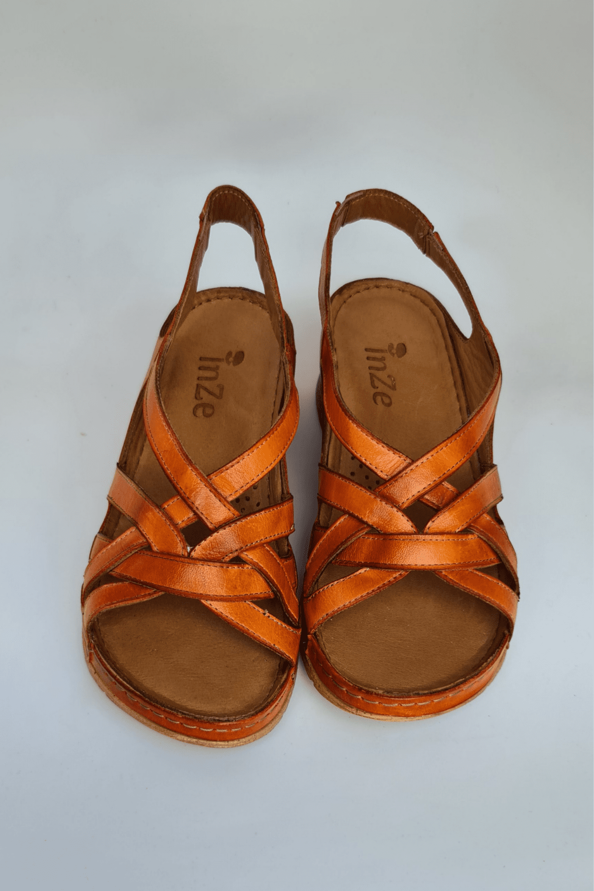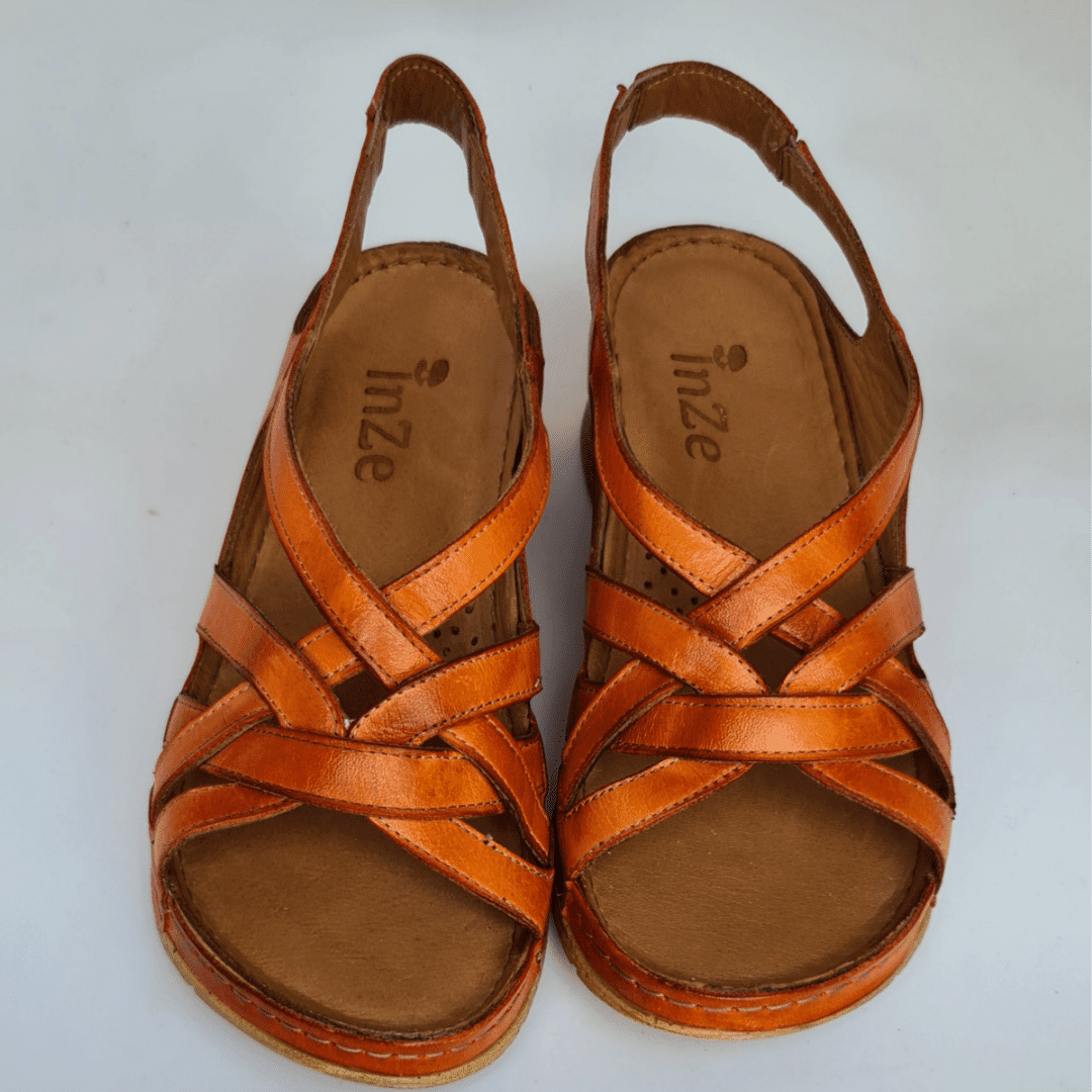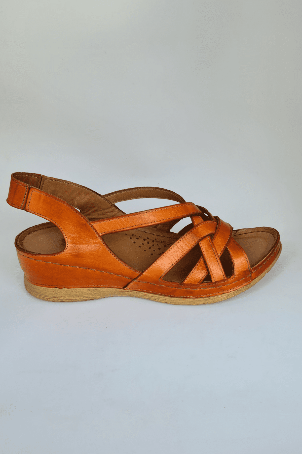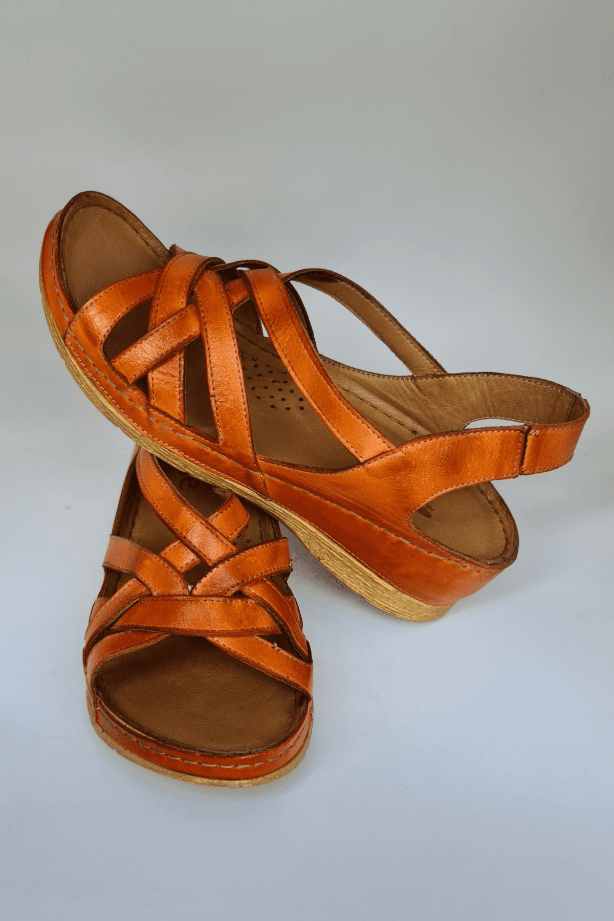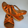 ÇOK BANTLI, İÇ DIŞ HAKİKİ DERİ, ARKA AYARLANABİLİR TOKALI,DESENLİ POLİÜRETAN MANTAR TABAN, DOLGU TOPUK.