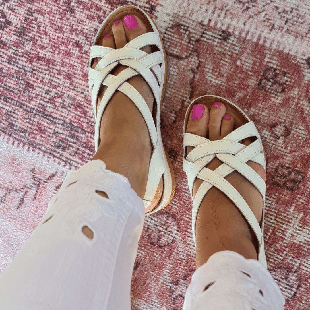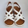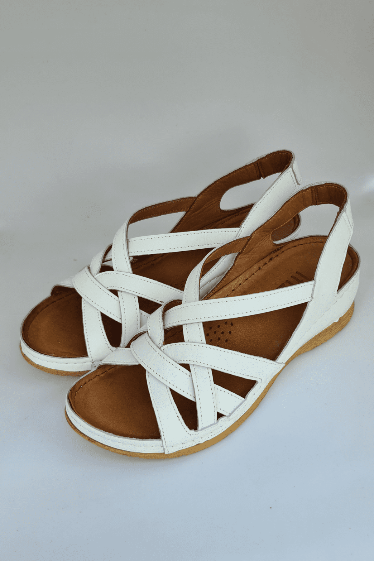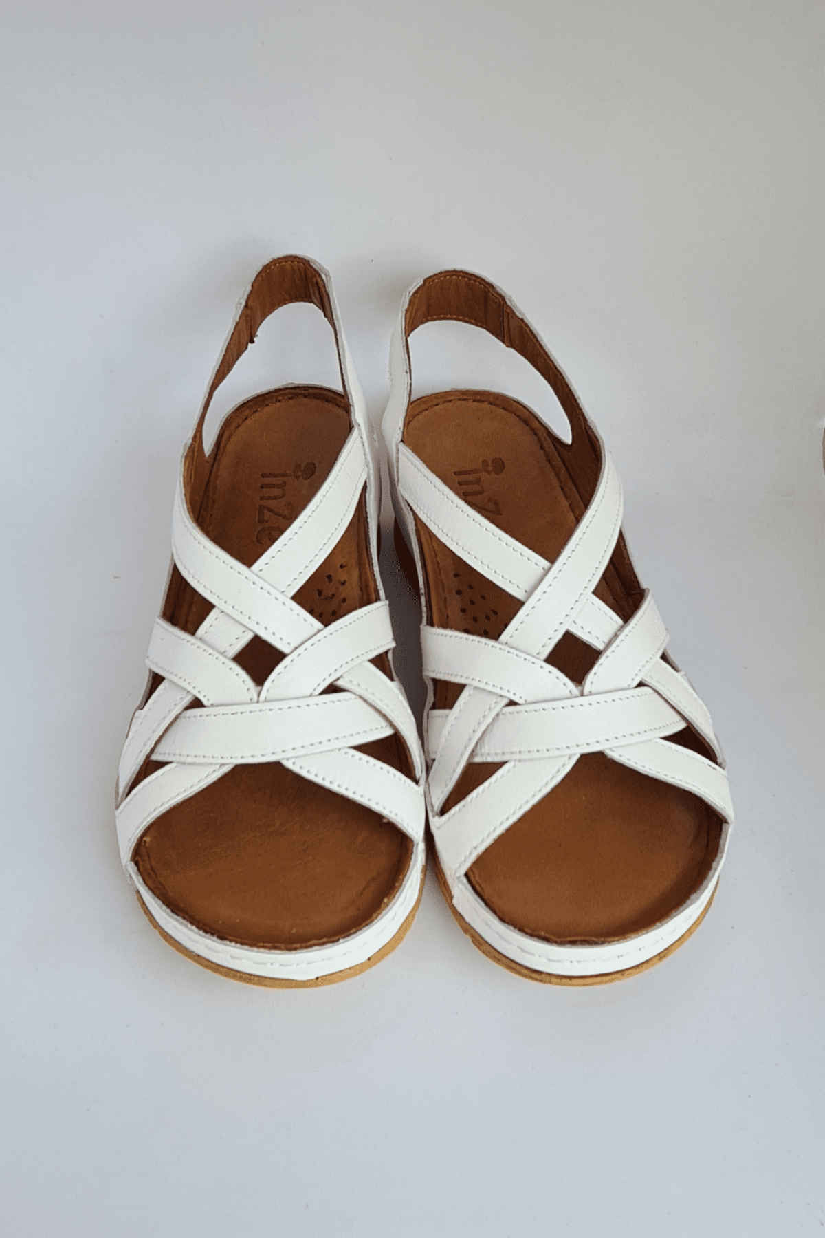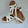 ÇOK BANTLI, İÇ DIŞ HAKİKİ DERİ, ARKA AYARLANABİLİR TOKALI,DESENLİ POLİÜRETAN MANTAR TABAN, DOLGU TOPUK.
