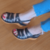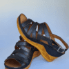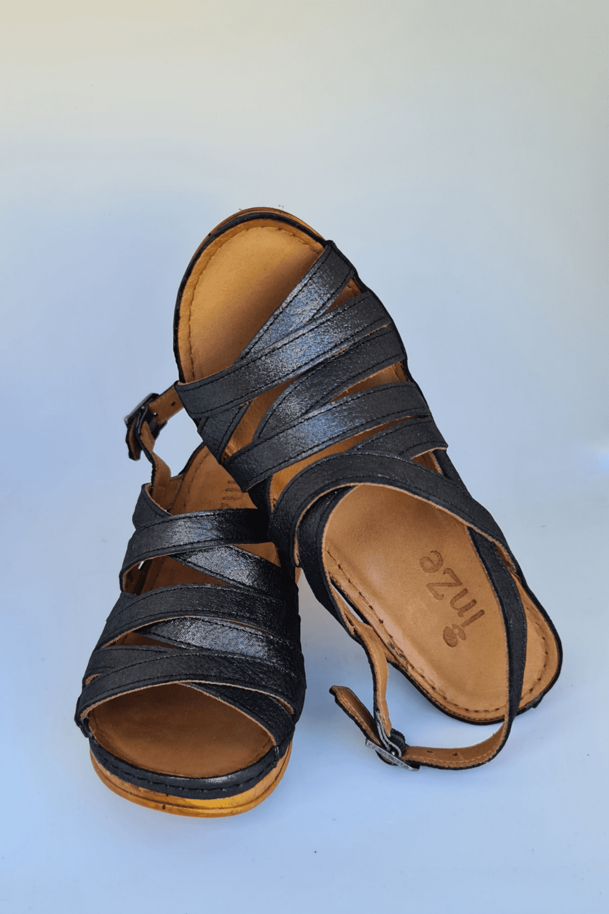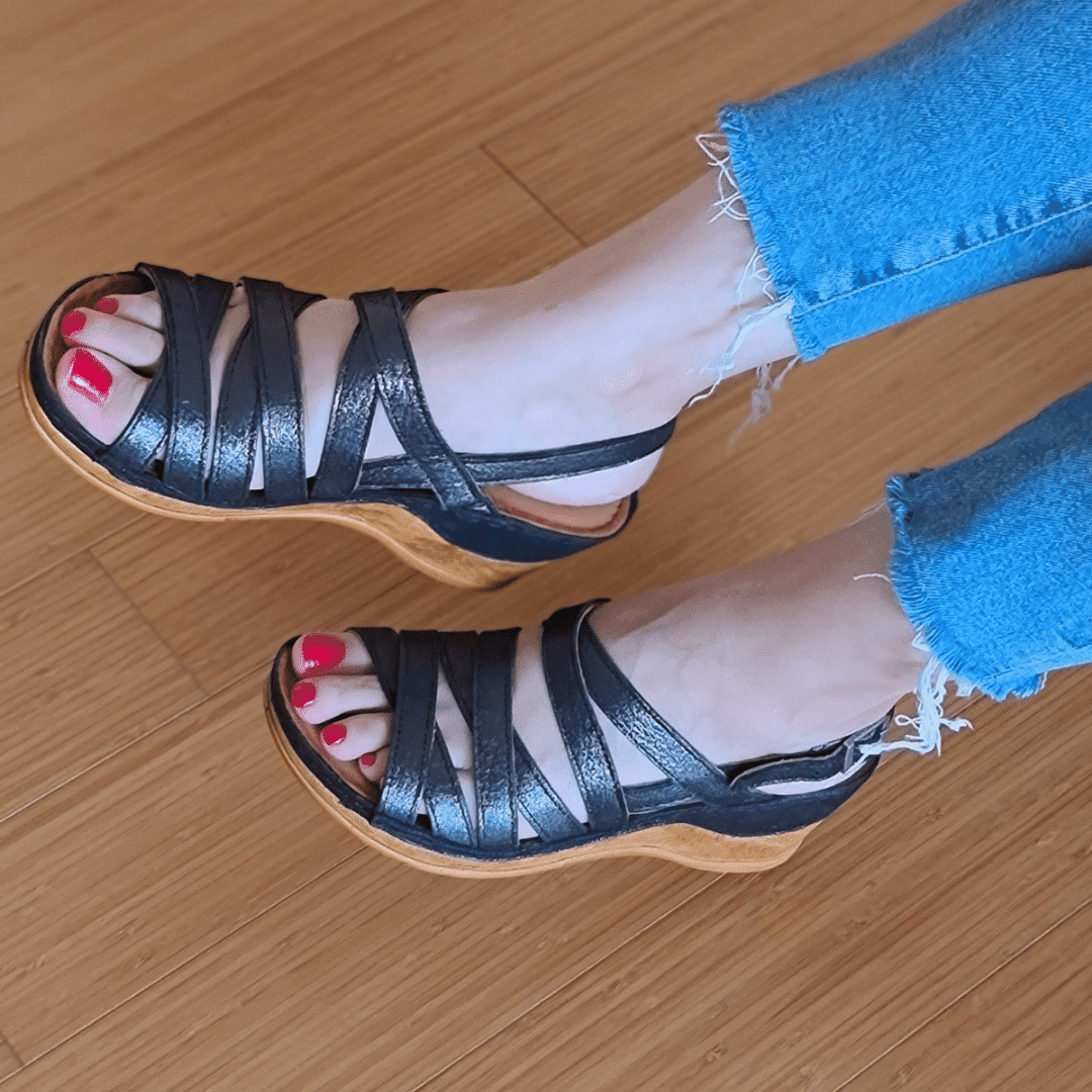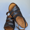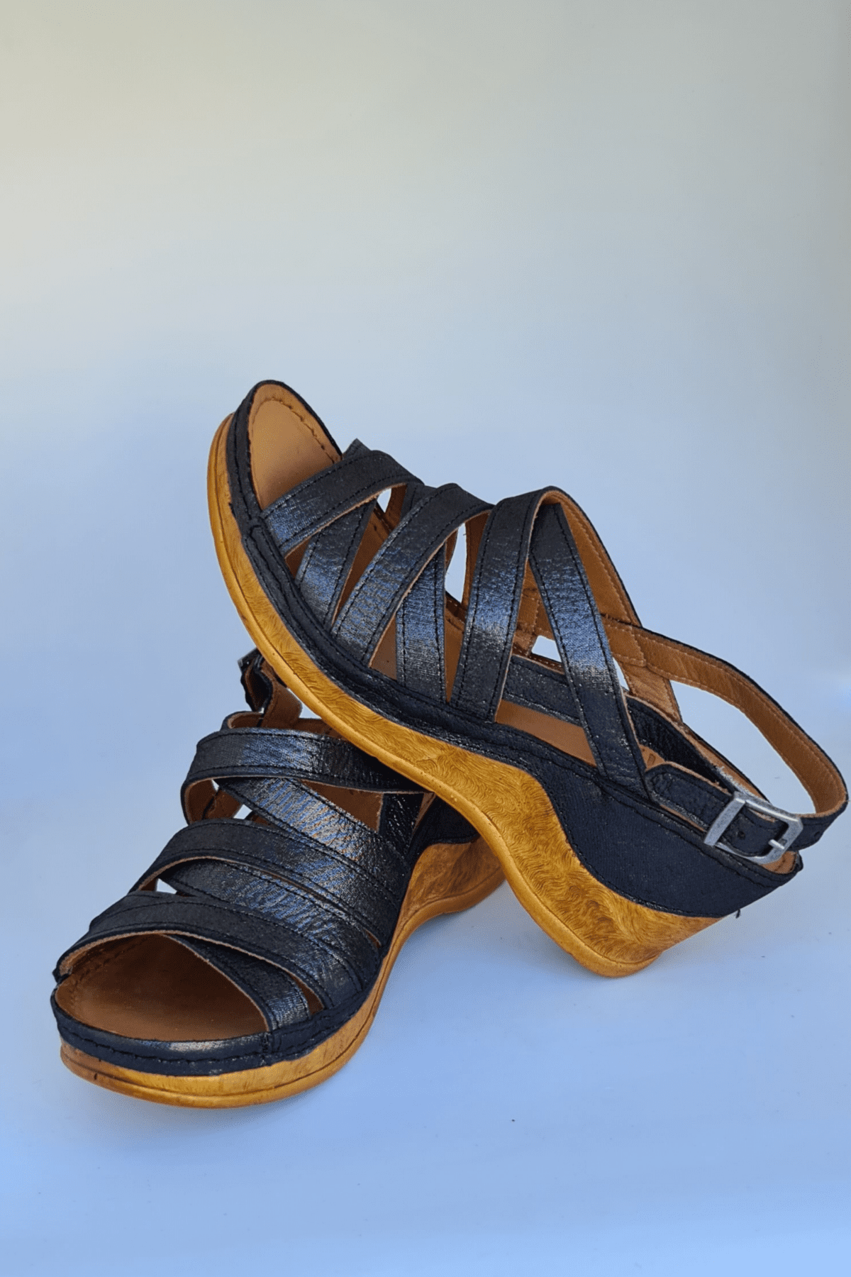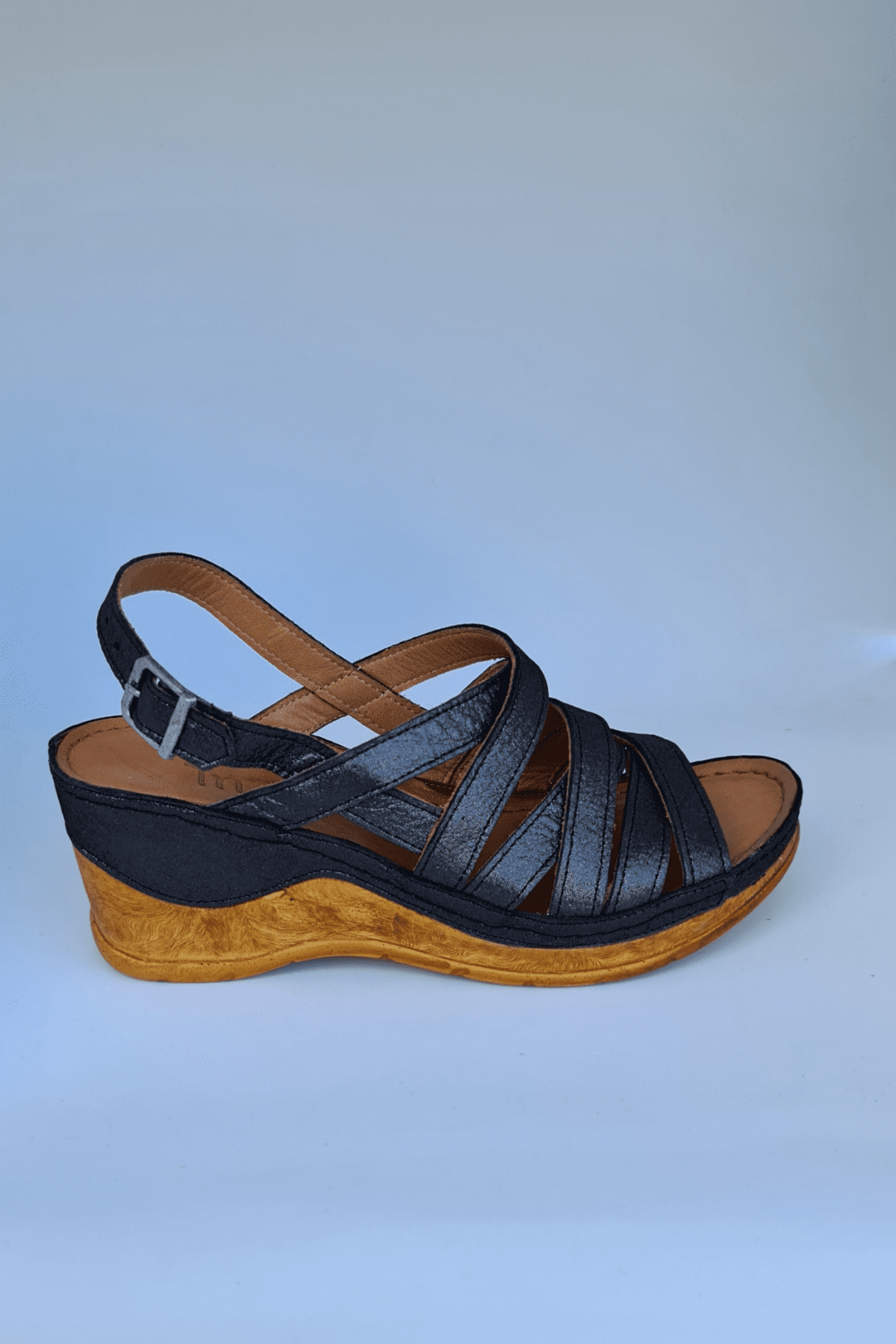 ÇOK BANTLI, İÇ DIŞ HAKİKİ DERİ, ARKA AYARLANABİLİR TOKALI,DESENLİ POLİÜRETAN MANTAR TABAN, DOLGU TOPUK.
