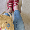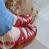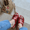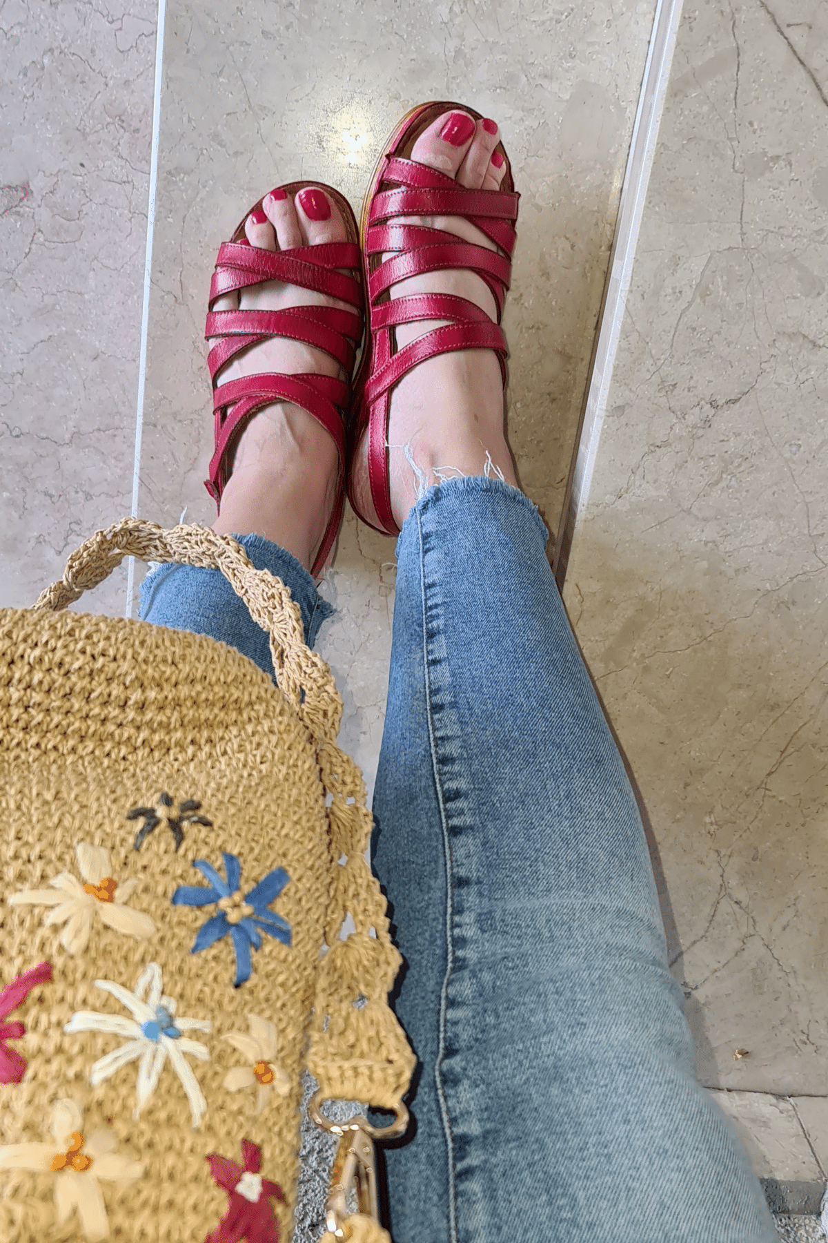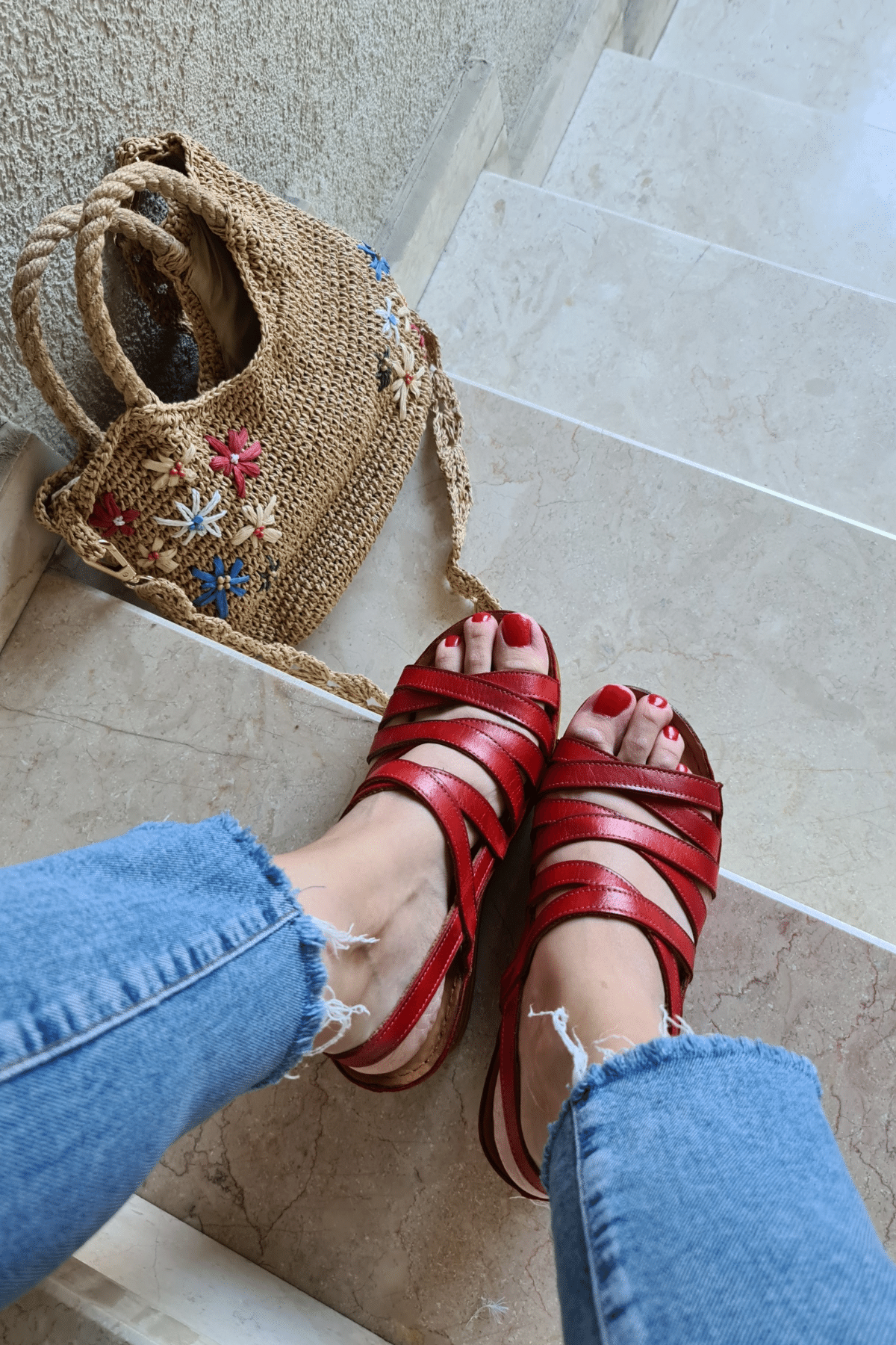 DERİ ÖRGÜLÜ, İÇ DIŞ HAKİKİ DERİ, ANTİK TOKA DETAYLI, YAN CIRT BANTLI, POLİÜRETAN MANTAR TABAN.