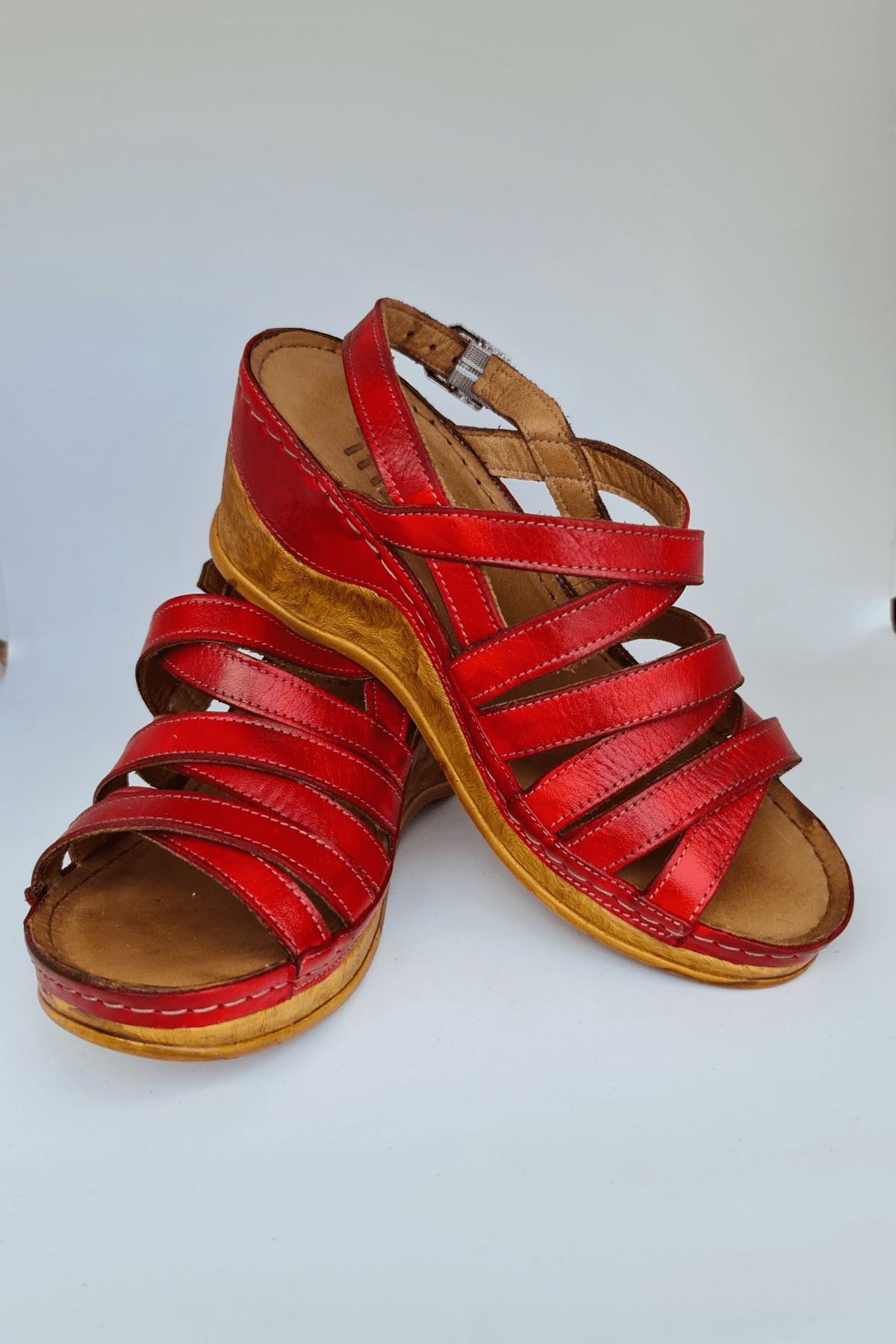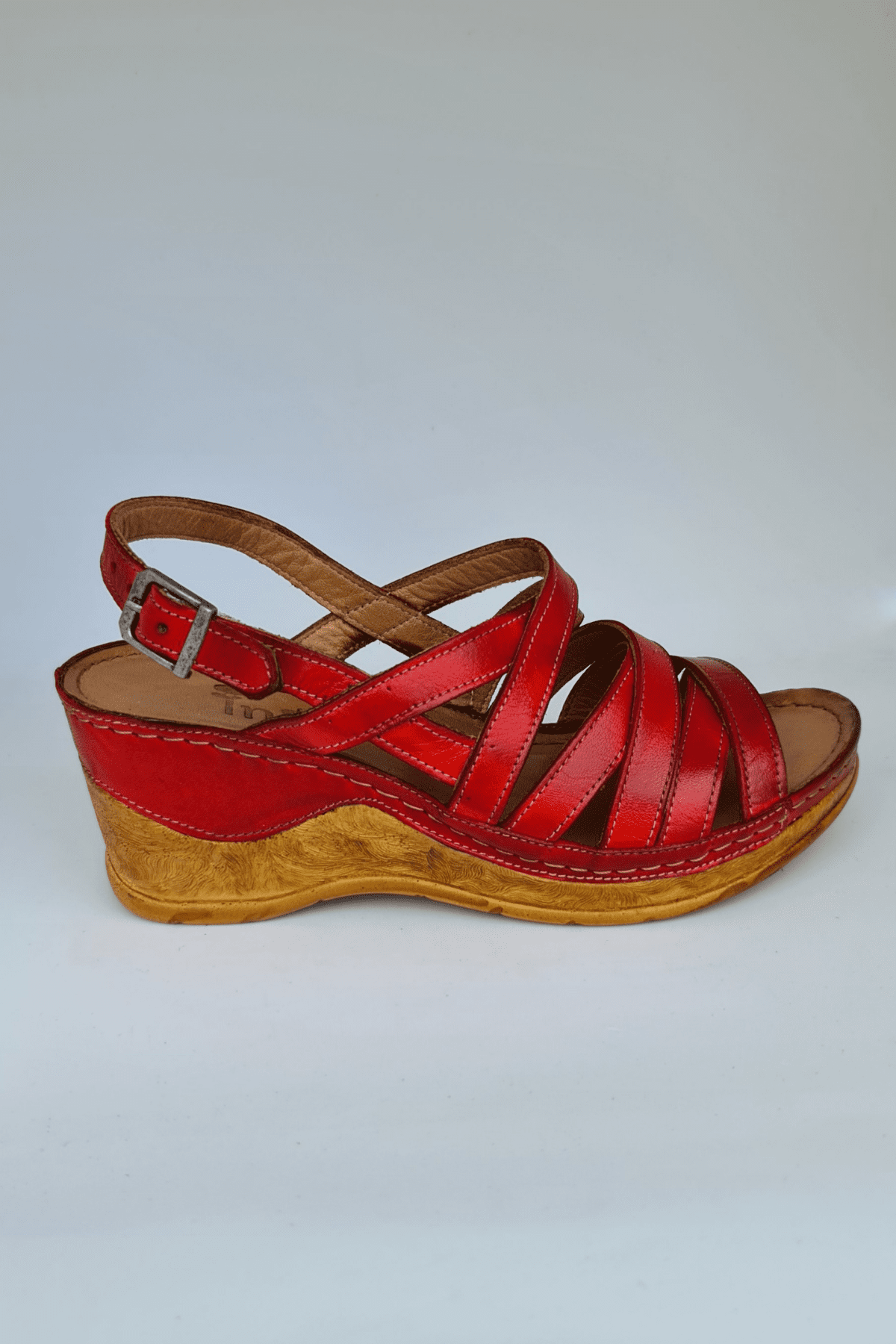 ÇOK BANTLI, İÇ DIŞ HAKİKİ DERİ, ARKA AYARLANABİLİR TOKALI,DESENLİ POLİÜRETAN MANTAR TABAN, DOLGU TOPUK.