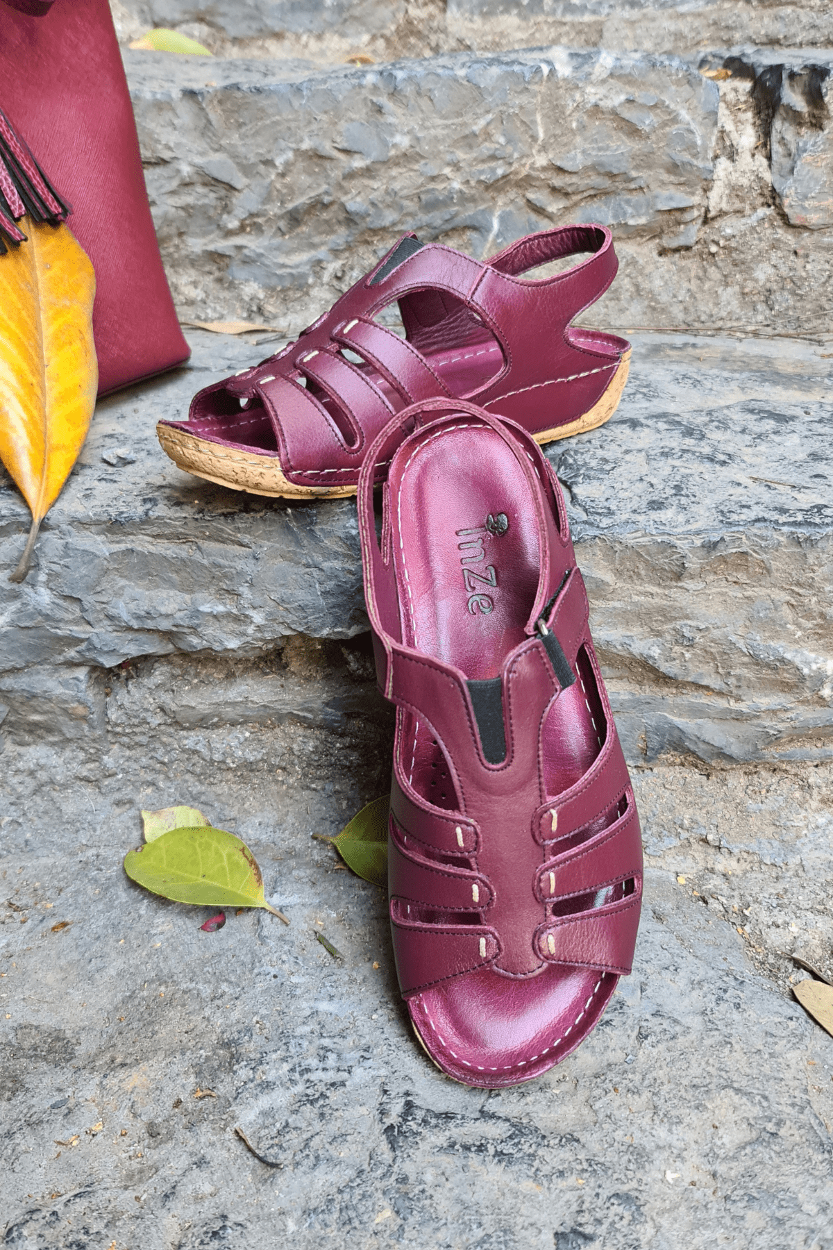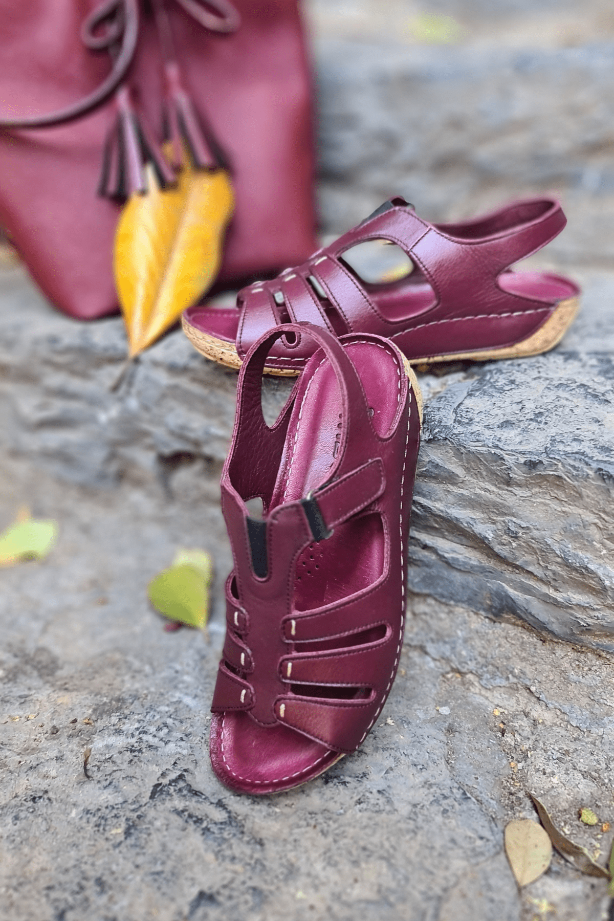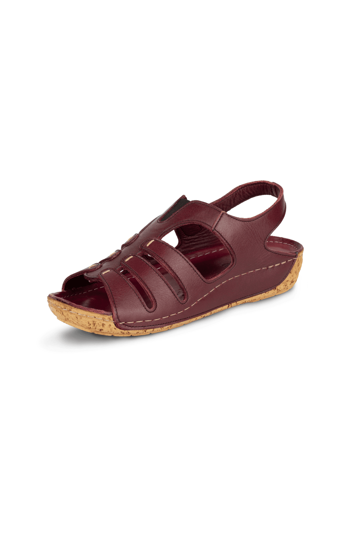 ÇOK BANTLI, İÇ DIŞ HAKİKİ DERİ, ARKA AYARLANABİLİR TOKALI,DESENLİ POLİÜRETAN MANTAR TABAN, DOLGU TOPUK.