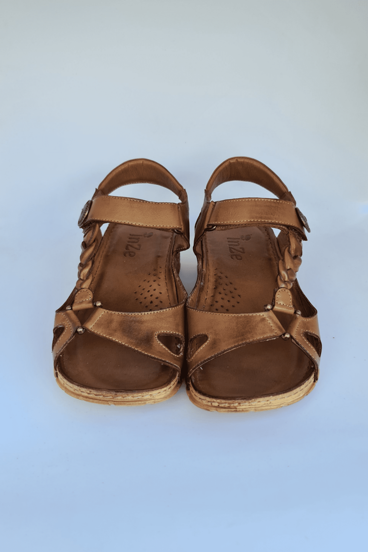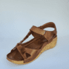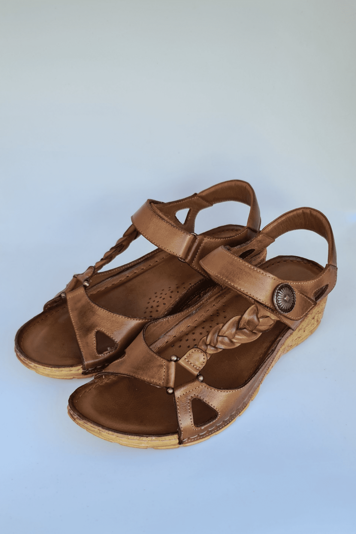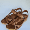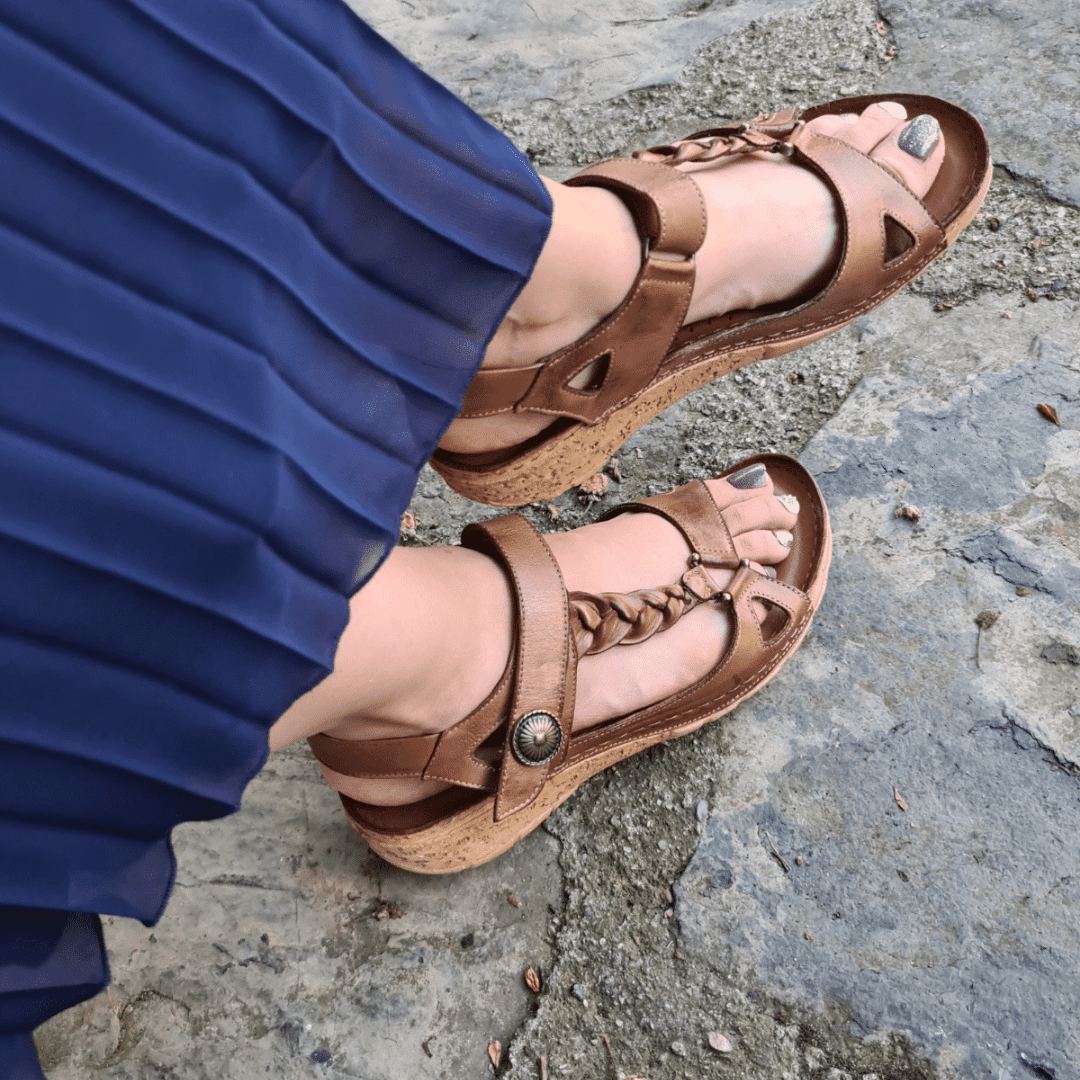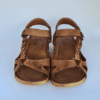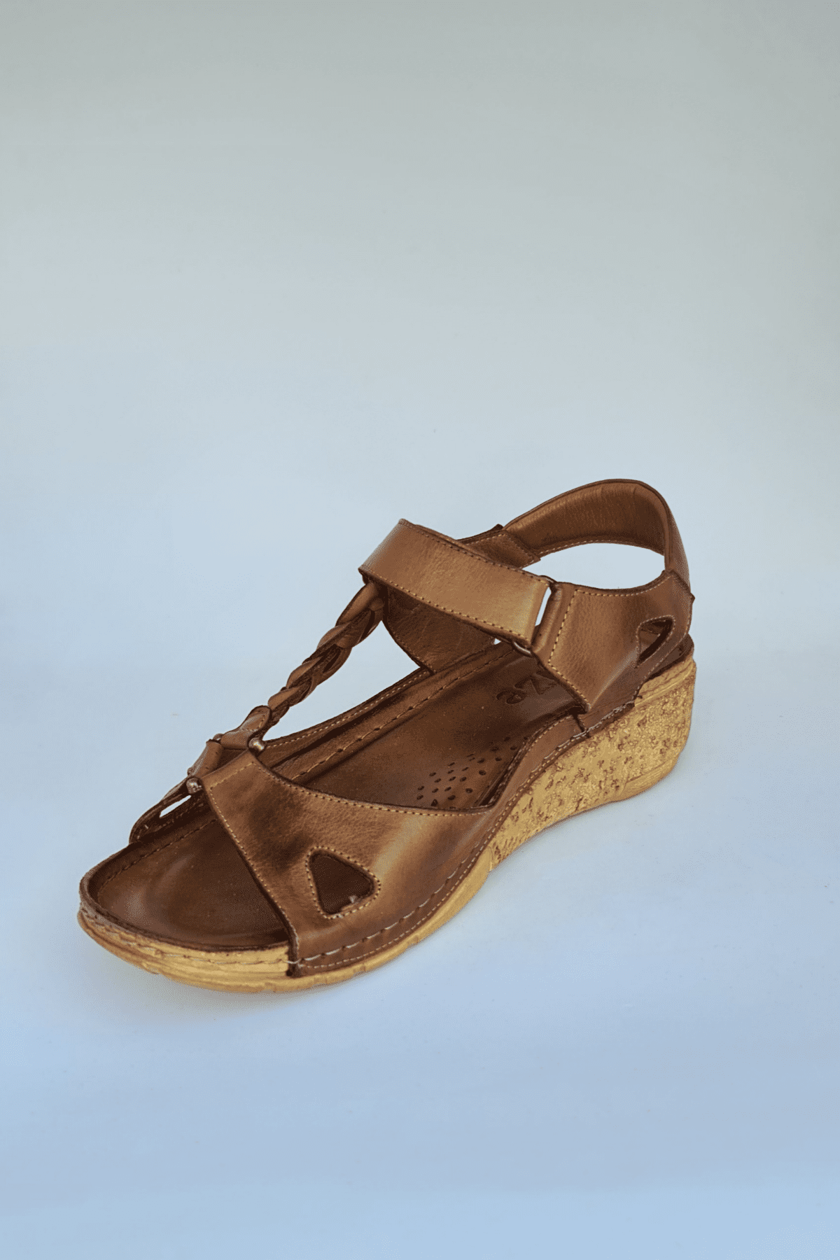 ÇOK BANTLI, İÇ DIŞ HAKİKİ DERİ, ARKA AYARLANABİLİR TOKALI,DESENLİ POLİÜRETAN MANTAR TABAN, DOLGU TOPUK.