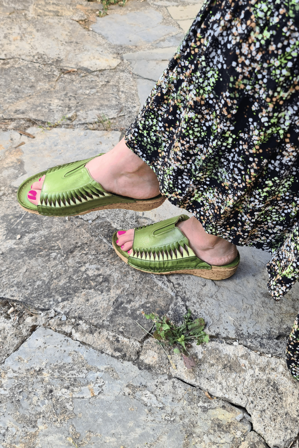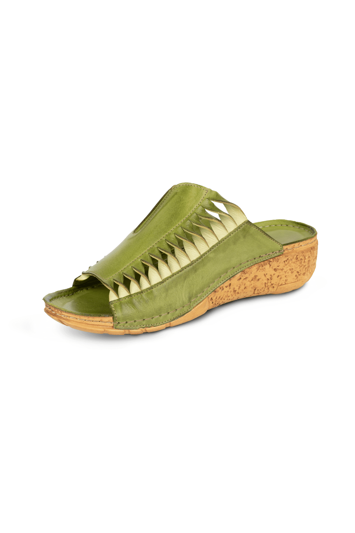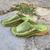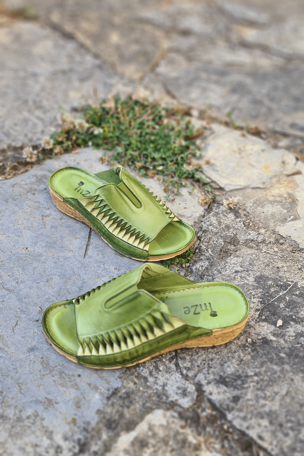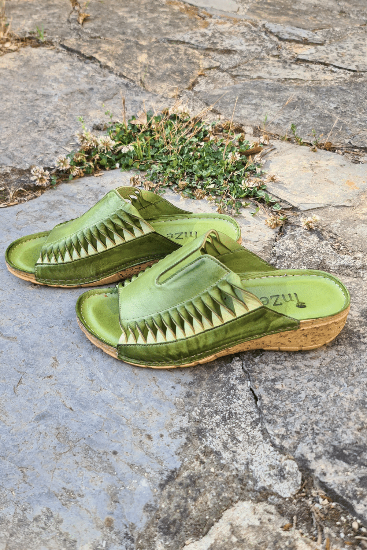 Çiçek detaylı, mantar poliüretan taban, iç dış hakiki deri.