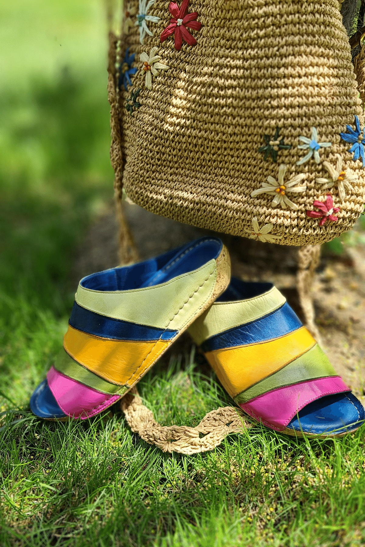DÖRT TOKALI, TROKLU, ÇOK RENKLİ, POLİÜRETAN MANTAR TABAN, DOLGU TOPUKLU, İÇ DIŞ HAKİKİ DERİ