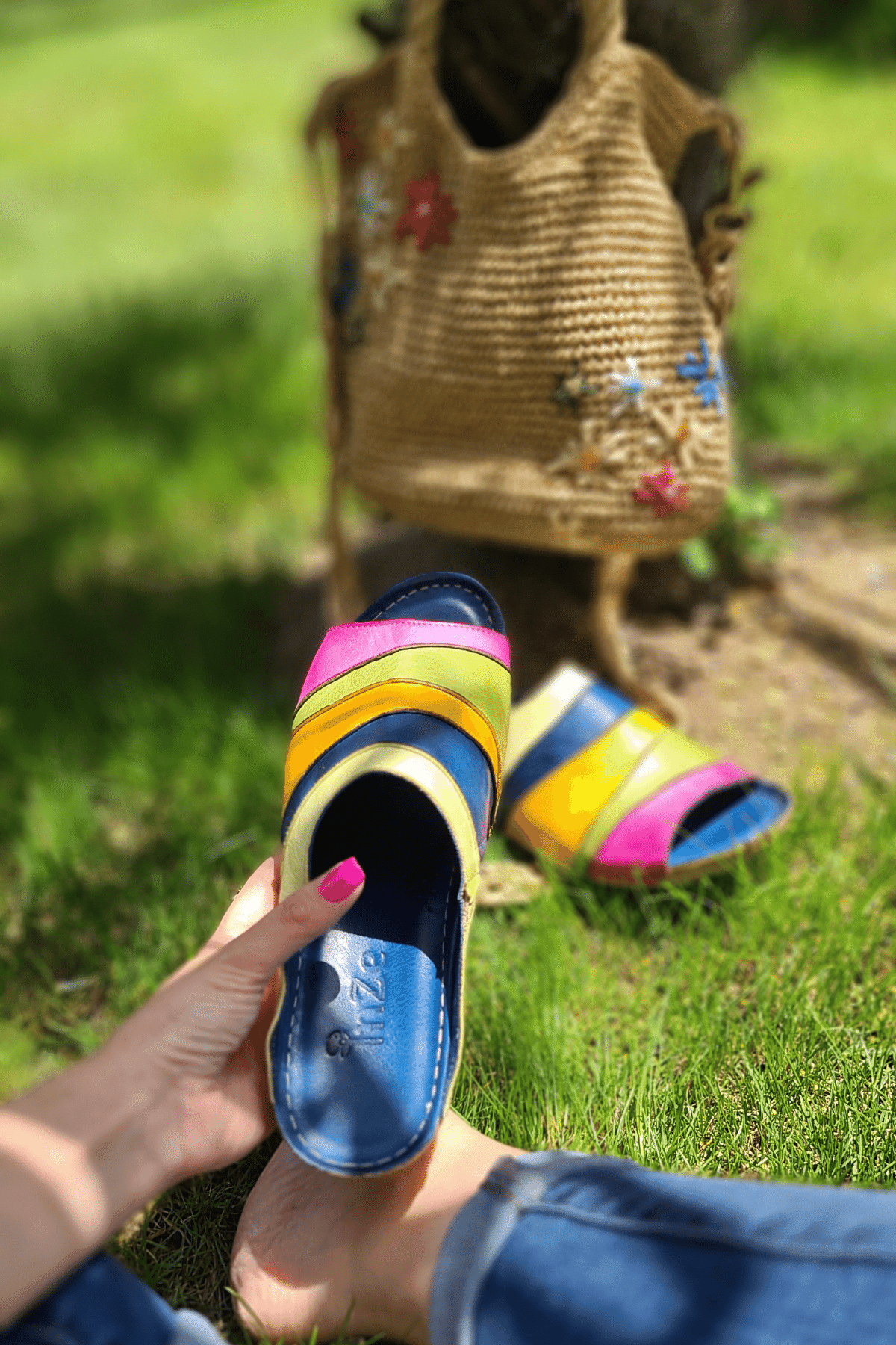 Çiçek detaylı, mantar poliüretan taban, iç dış hakiki deri.