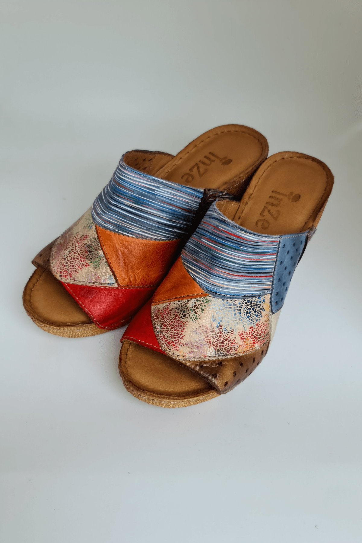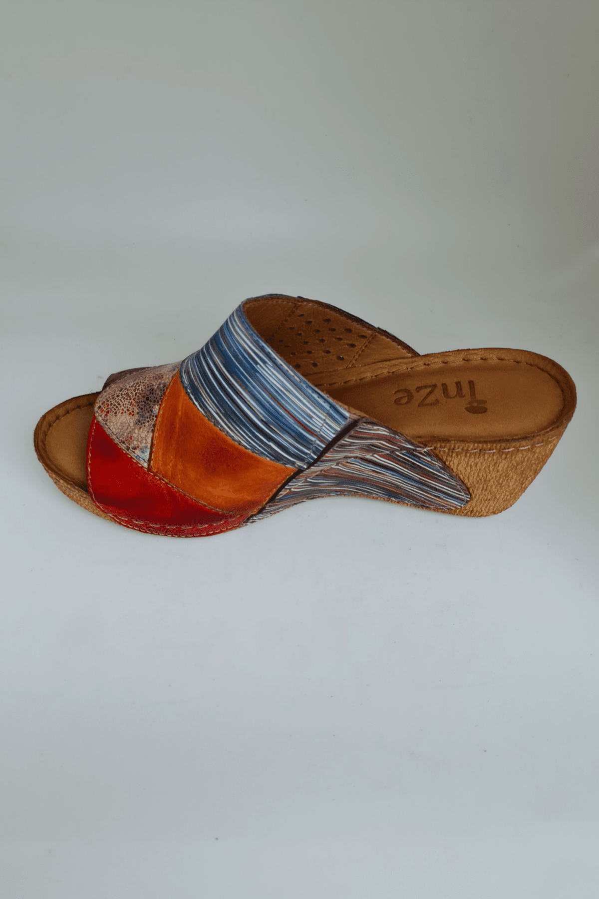 DÖRT TOKALI, TROKLU, ÇOK RENKLİ, POLİÜRETAN MANTAR TABAN, DOLGU TOPUKLU, İÇ DIŞ HAKİKİ DERİ.