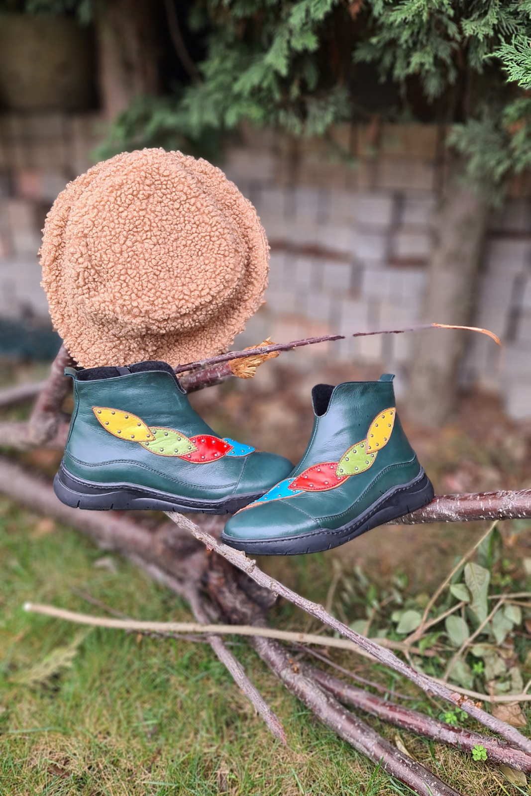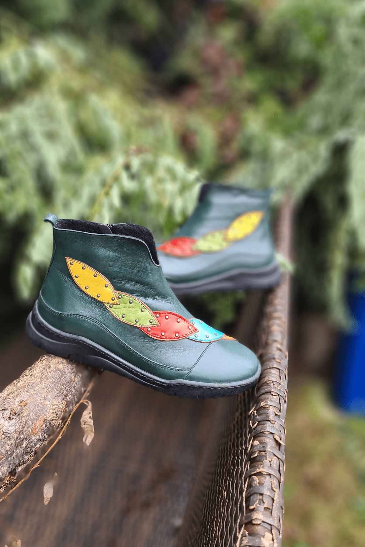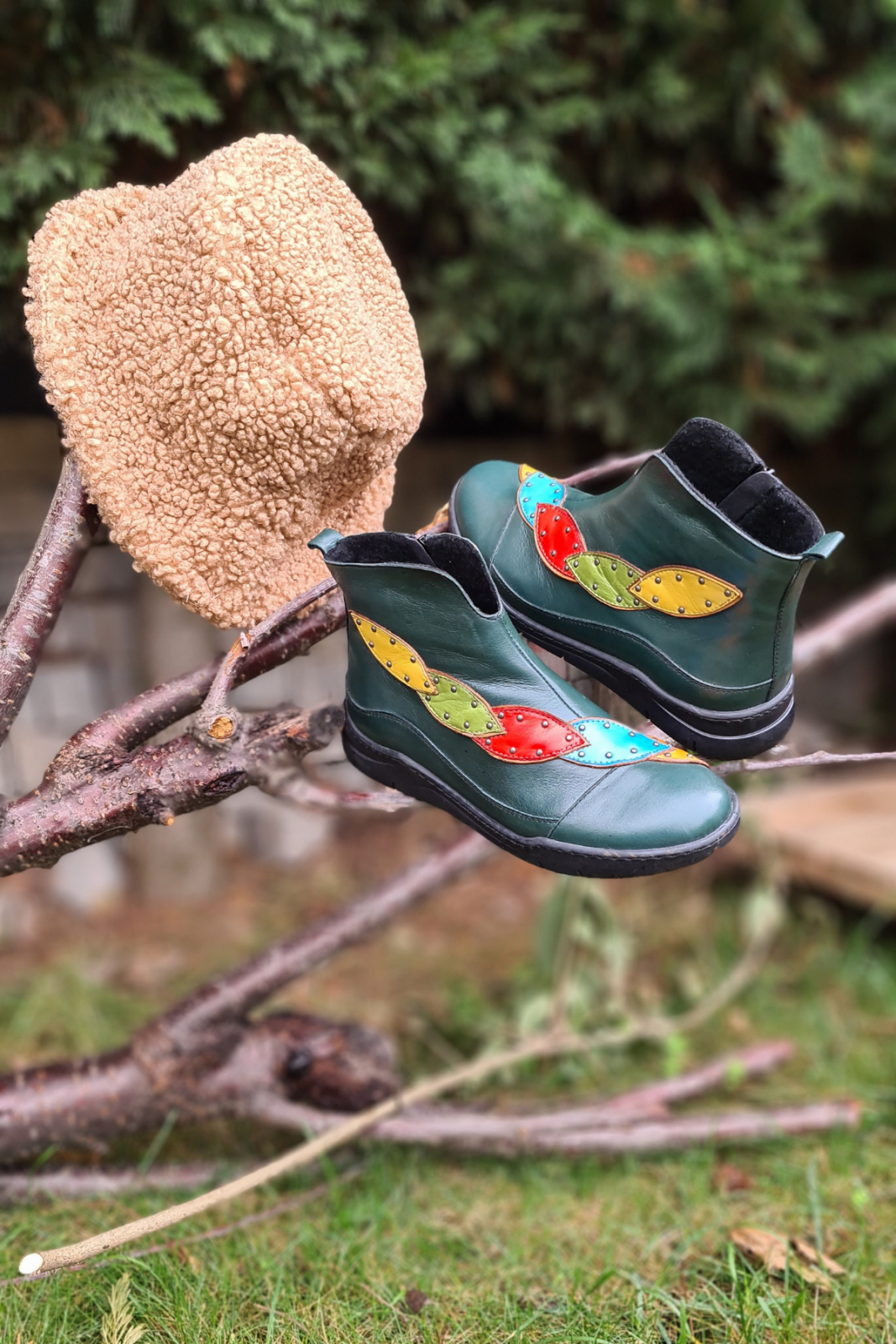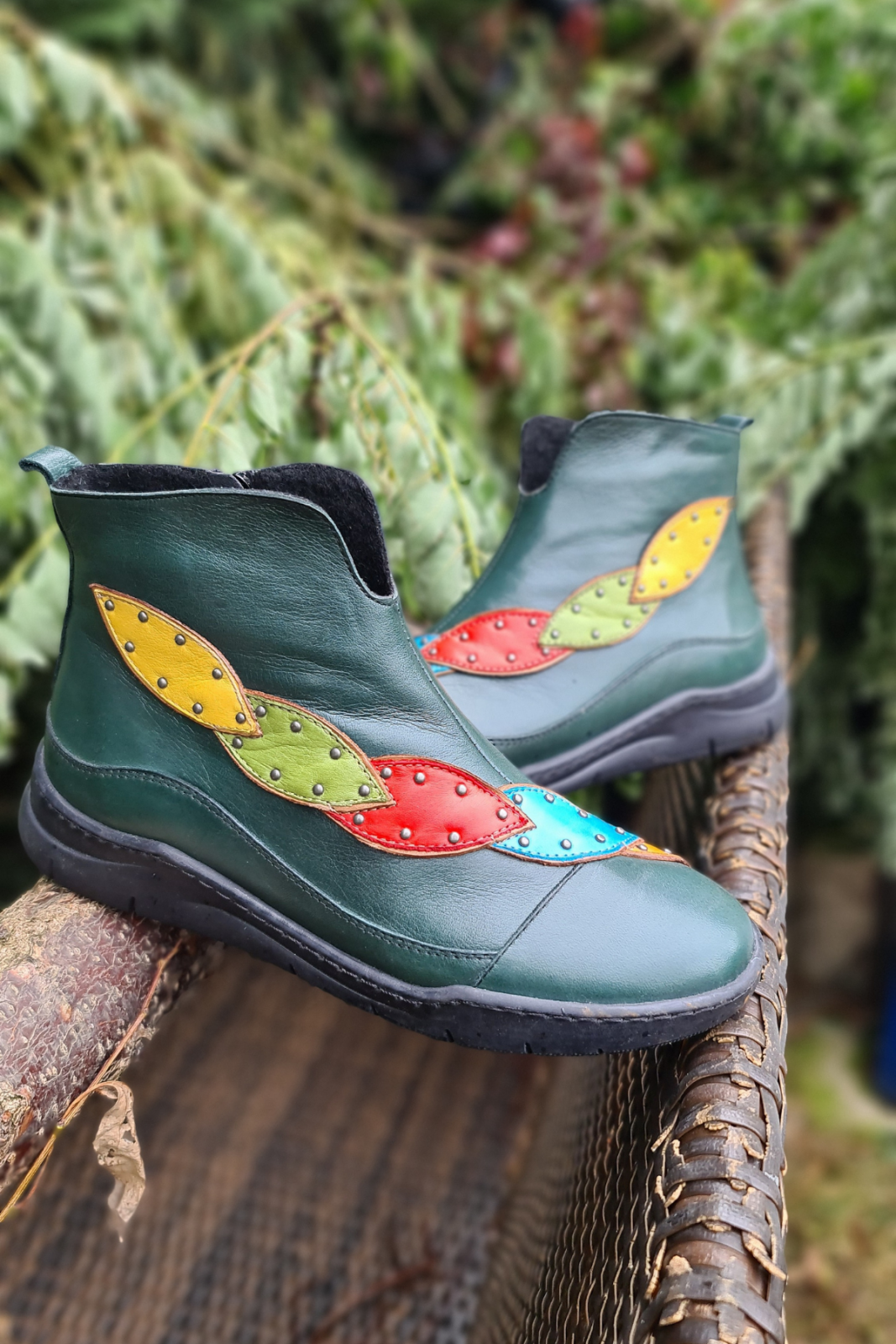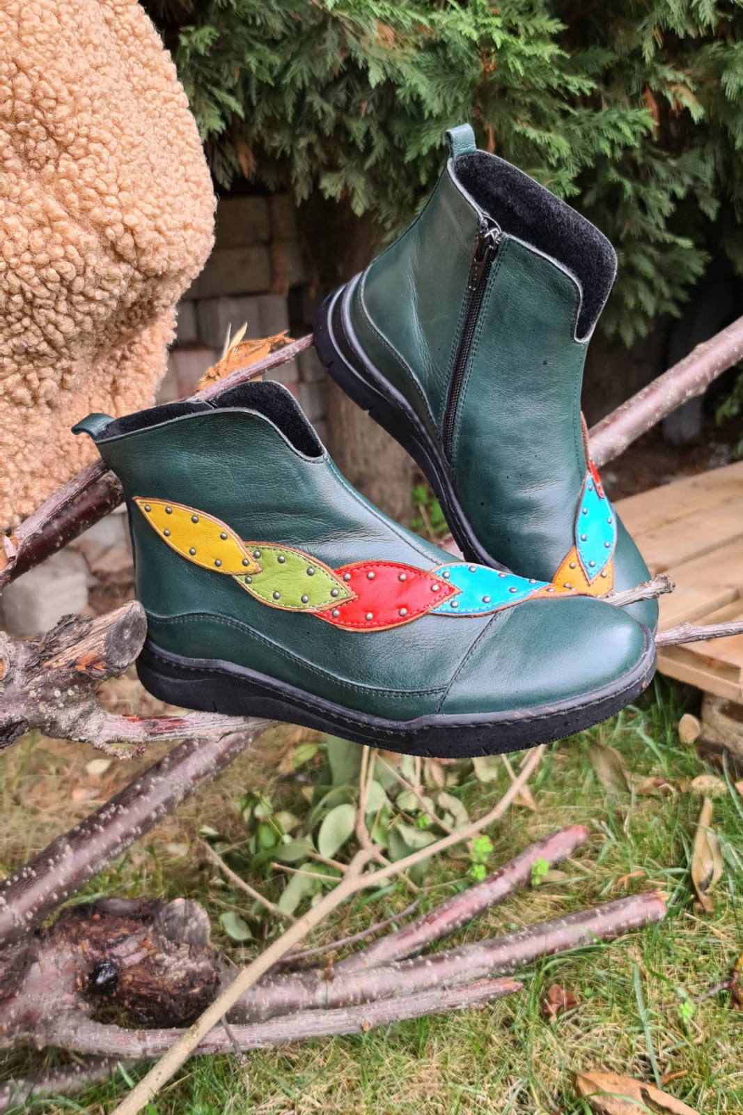 Hakiki deri bot, yan fermuarlı, renkli ve troklu yaprak detaylı, termo taban, çıkarılabilir microfiber lateks fuspet
