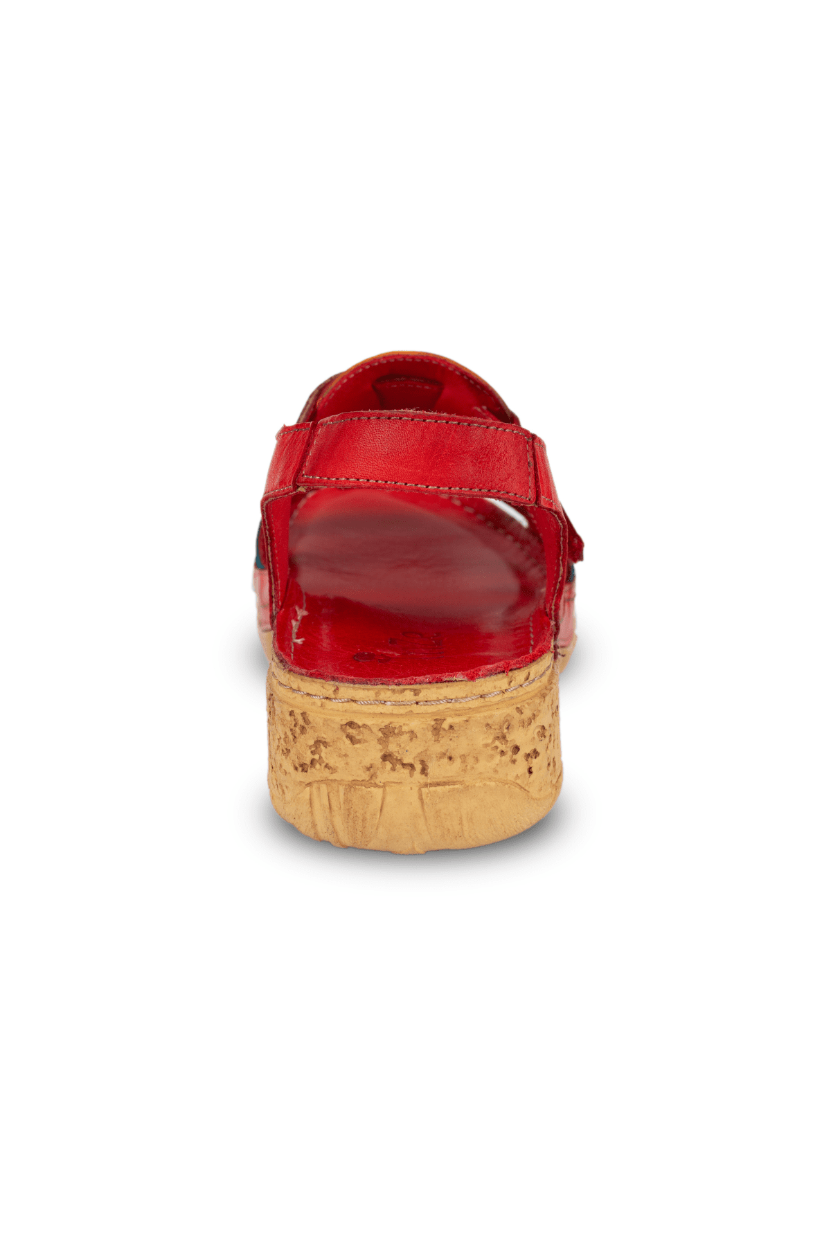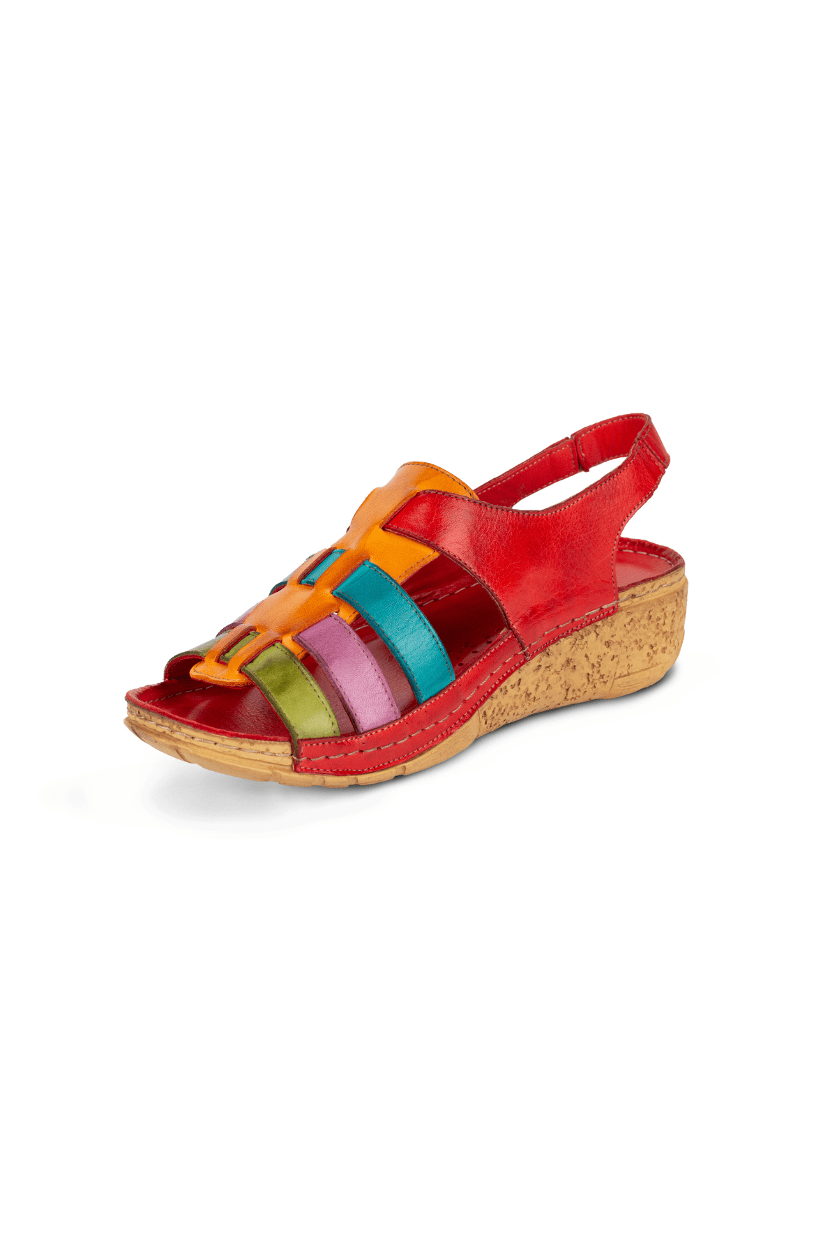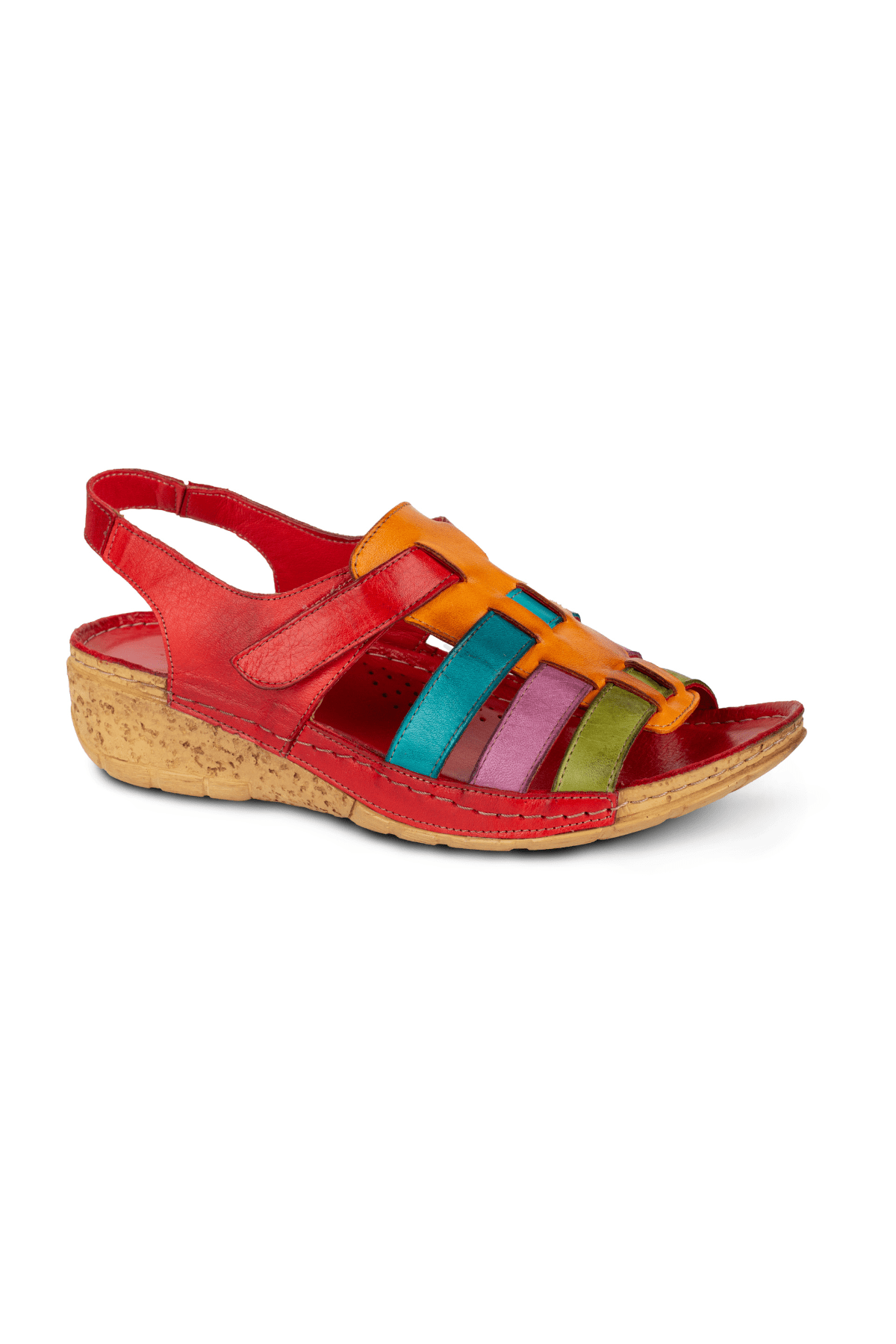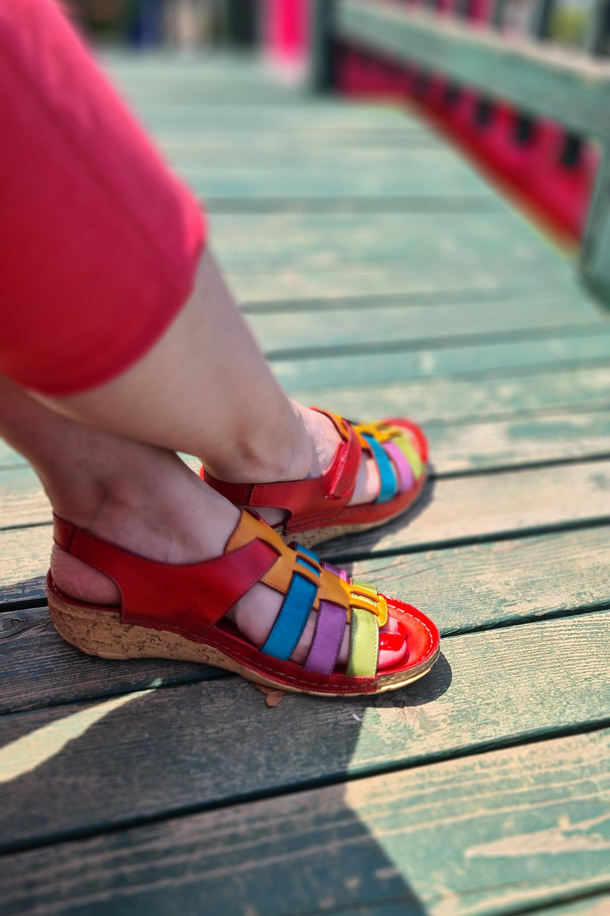 ÇOK RENKLİ BANT DETAYLI, YANDAN CIRTLI, ARKA BİLEKTEN LASTİKLİ, İÇİ VE DIŞI HAKİKİ DERİ,DOLGU TOPUKLU,POLİÜRETAN MANTAR TABAN