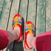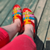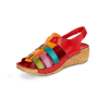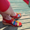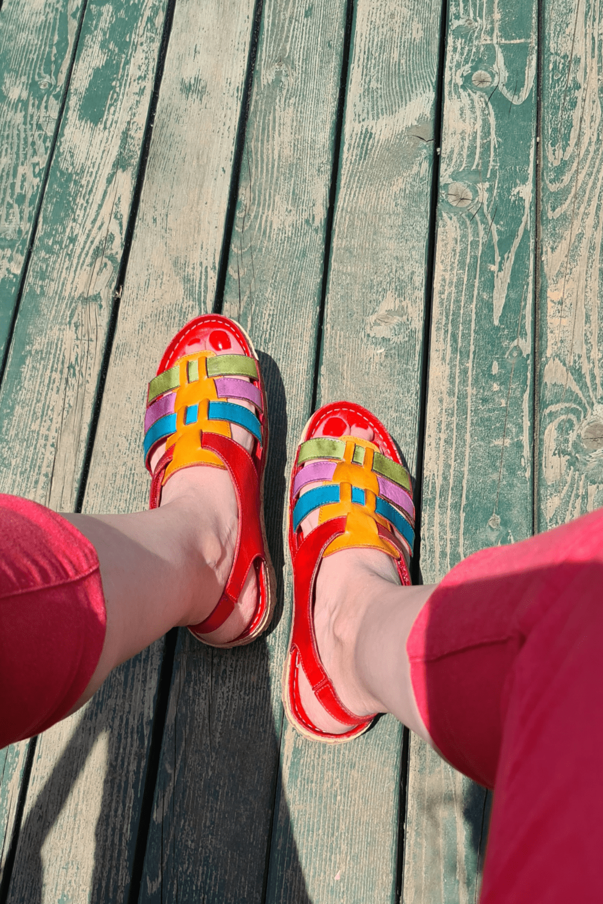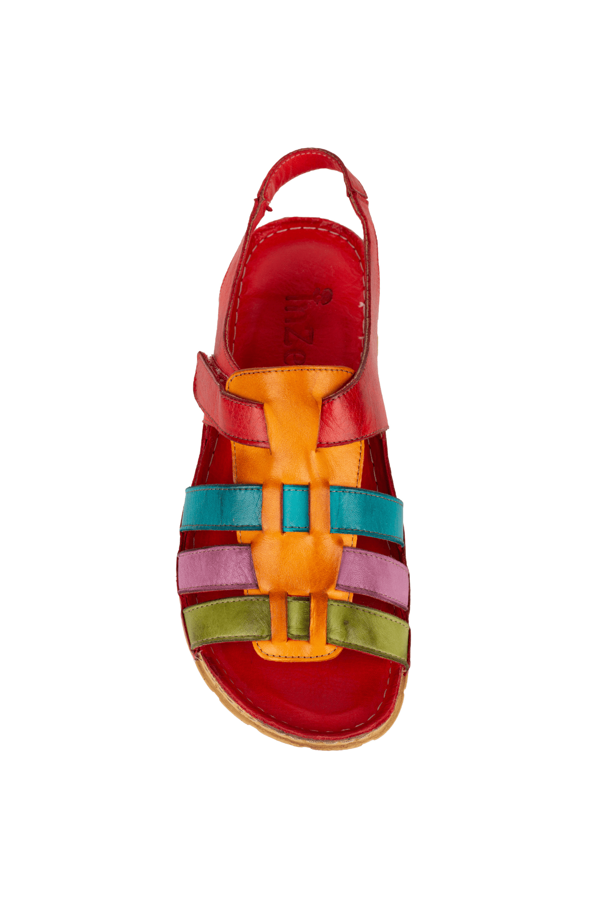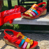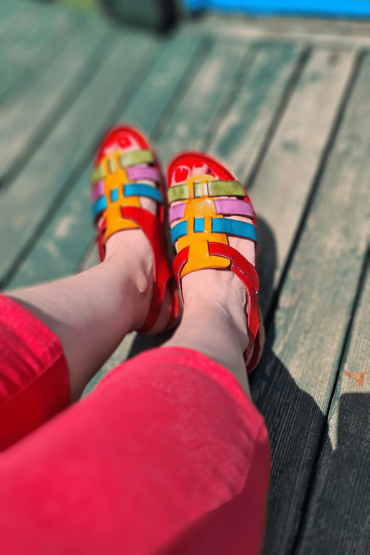 ÇOK RENKLİ BANT DETAYLI, YANDAN CIRTLI, ARKA BİLEKTEN LASTİKLİ, İÇİ VE DIŞI HAKİKİ DERİ,DOLGU TOPUKLU,POLİÜRETAN MANTAR TABAN