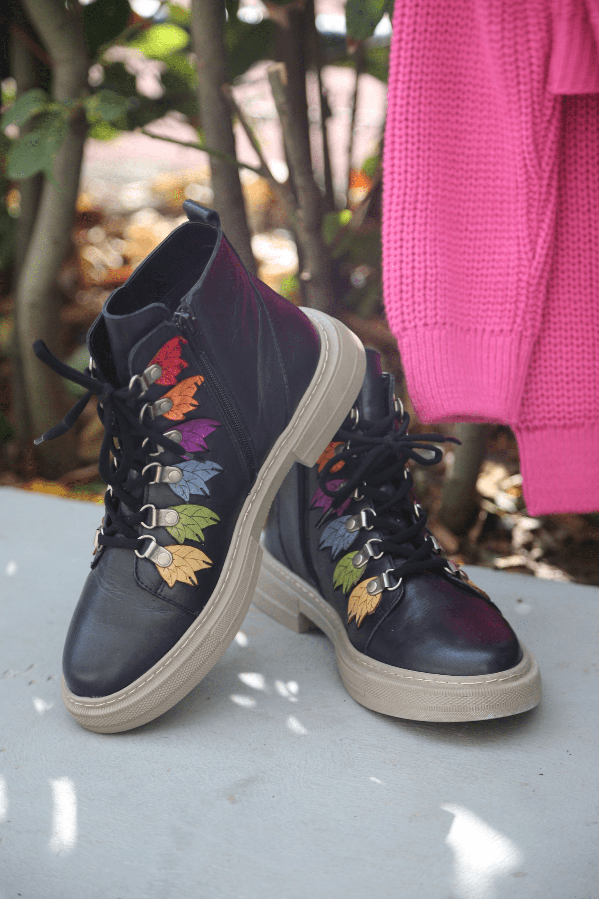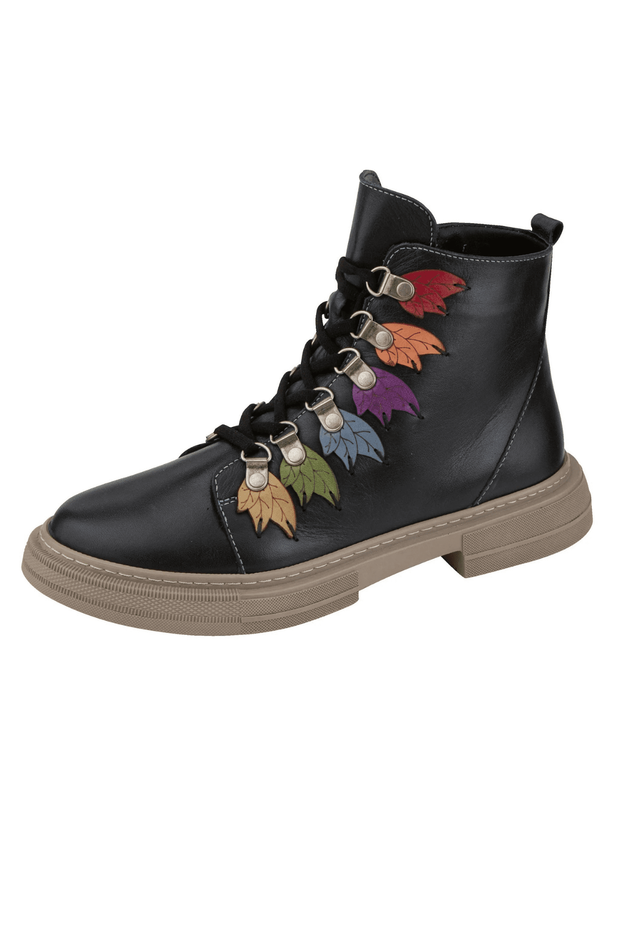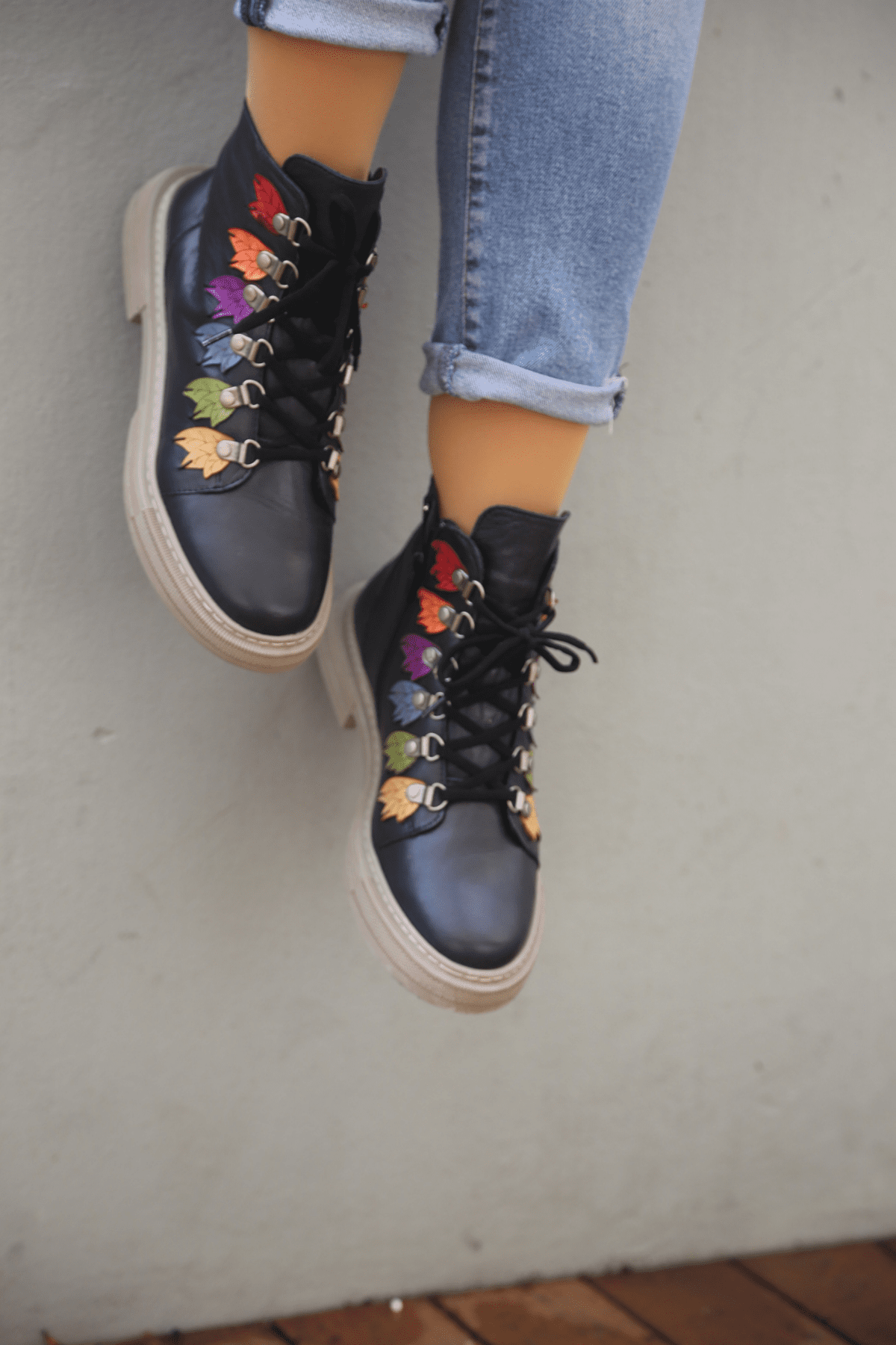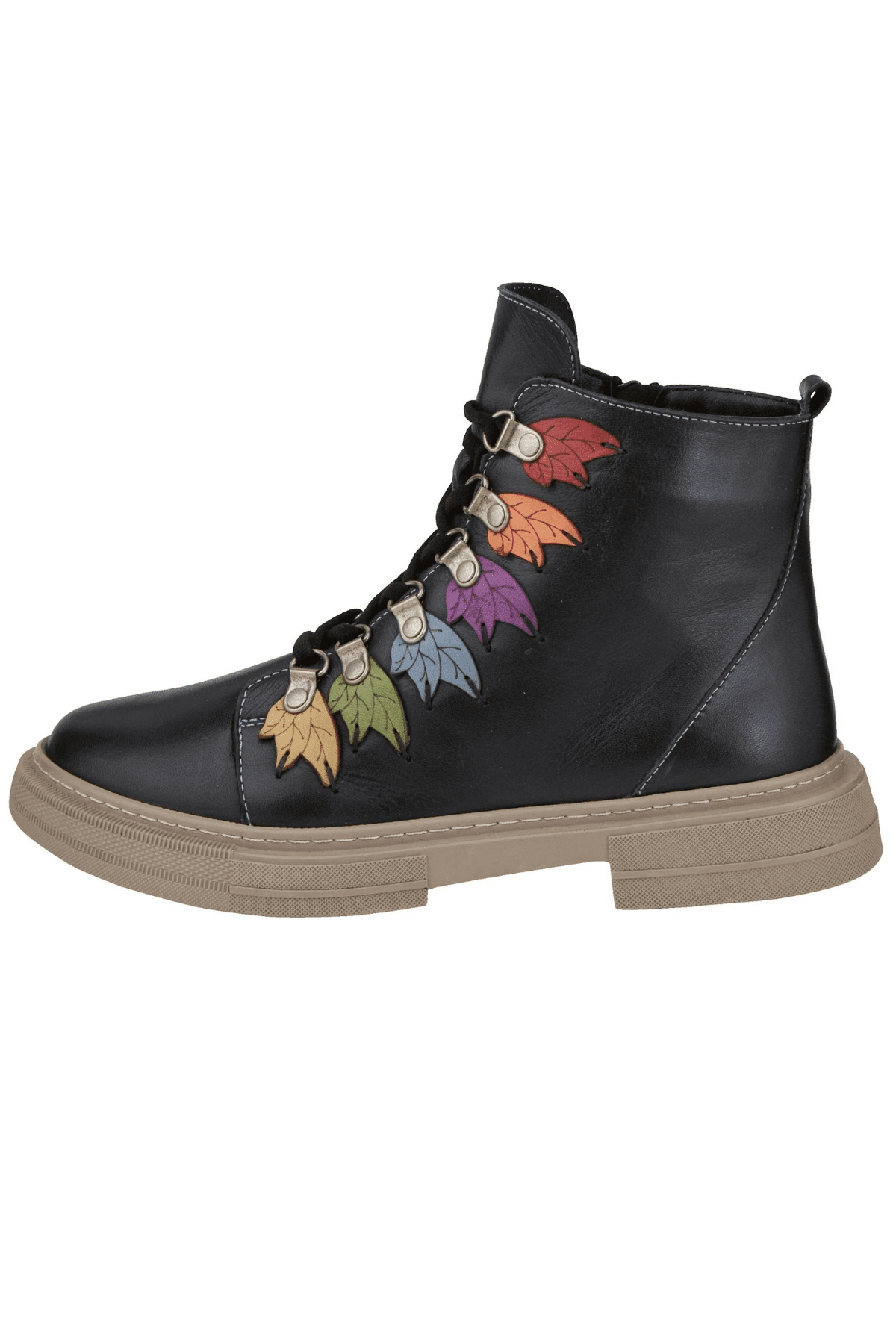 Hakiki deri bot, lastik bağcıklı, yan fermuarlı, renkli örme yaprak detaylı, kauçuk taban, çıkarılabilir microfiber lateks fuspet