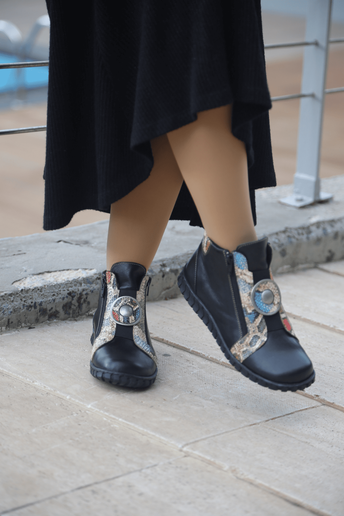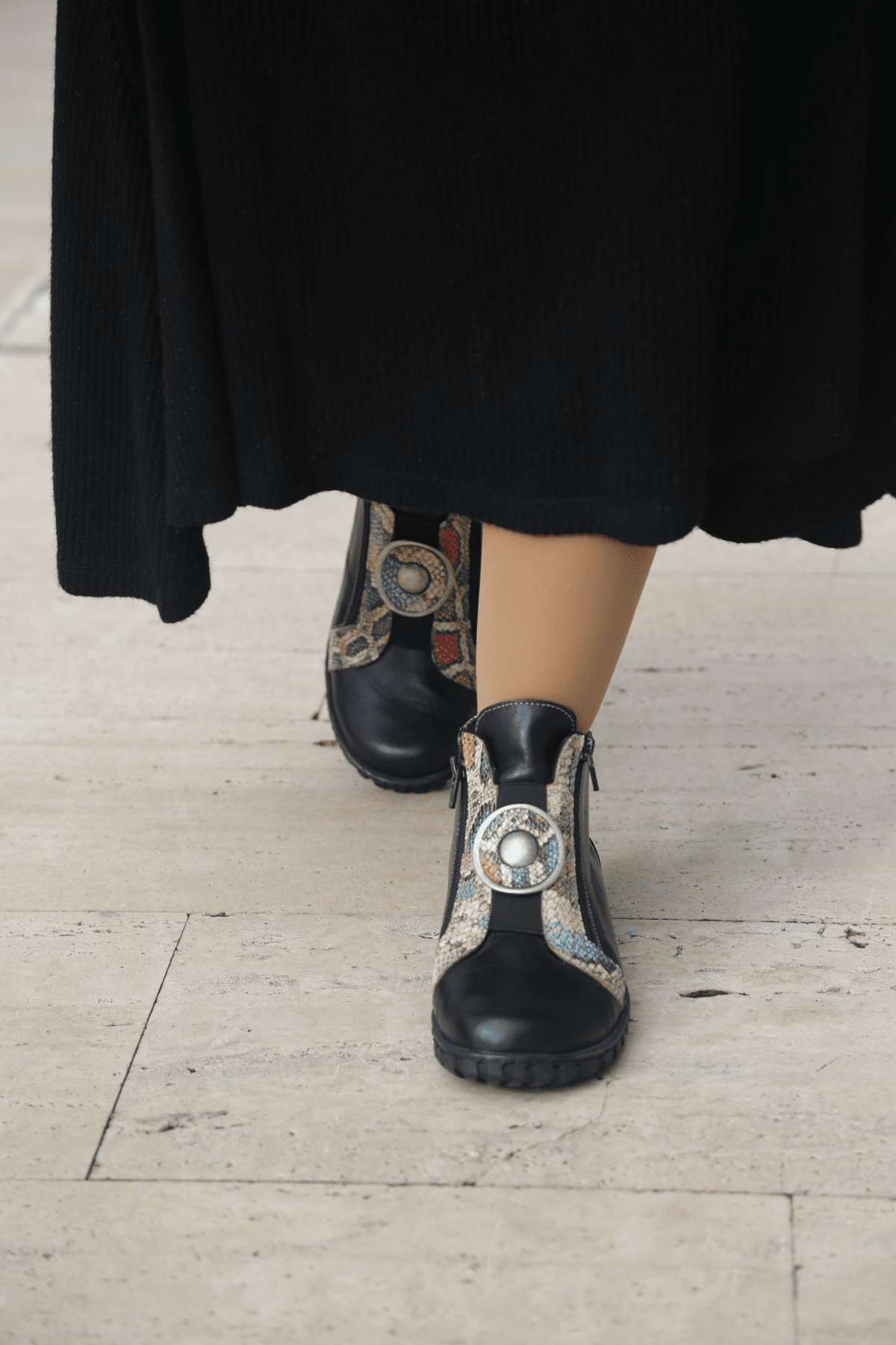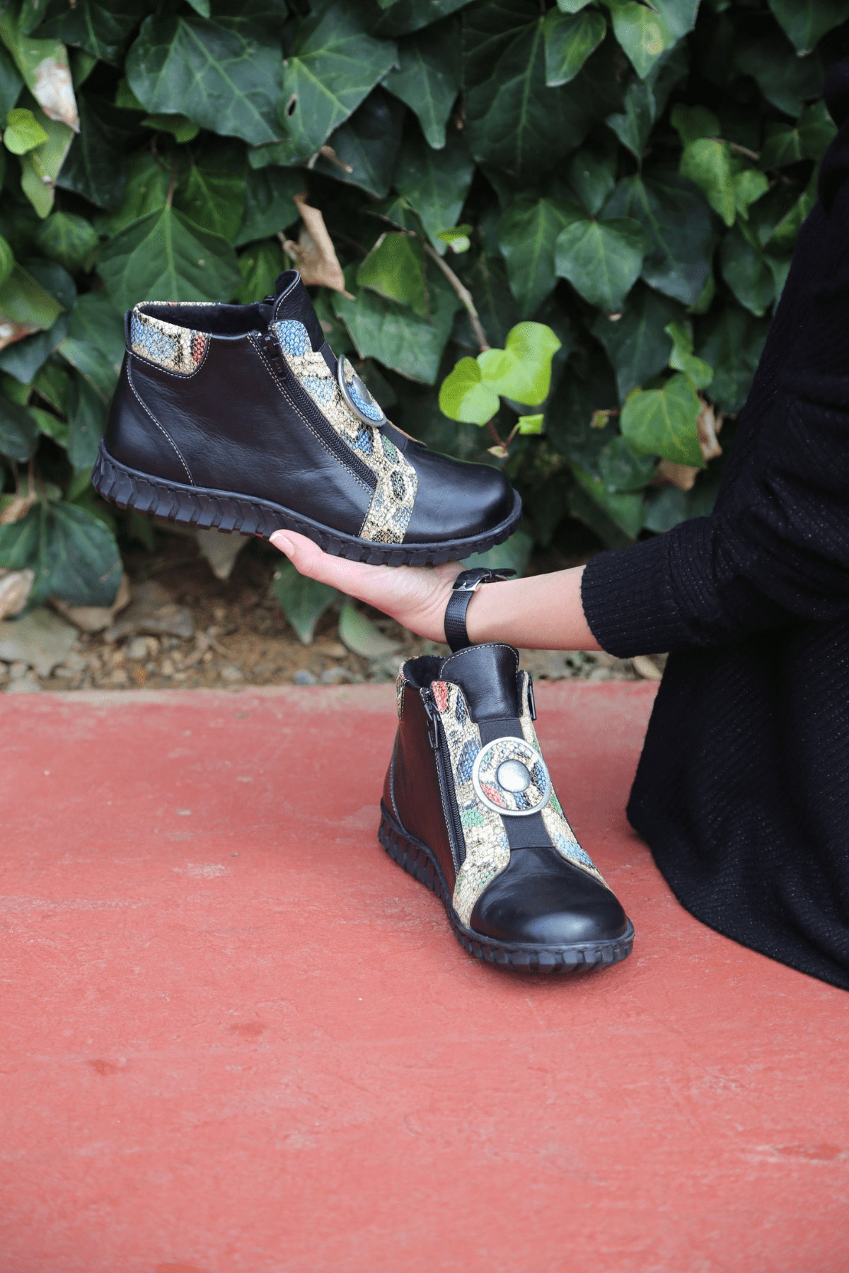 Hakiki deri bot, yılan deri desen detaylı, madalyon tokalı,çift taraf yan fermuarlı, ön lastikli, kauçuk taban, çıkarılabilir microfiber lateks fuspet
