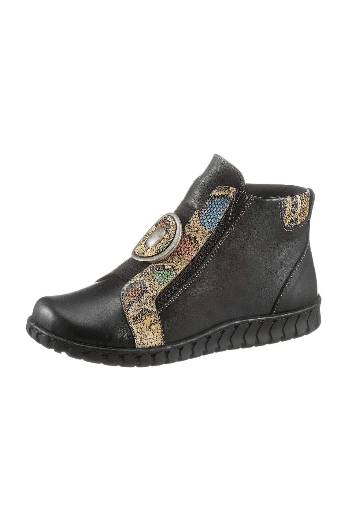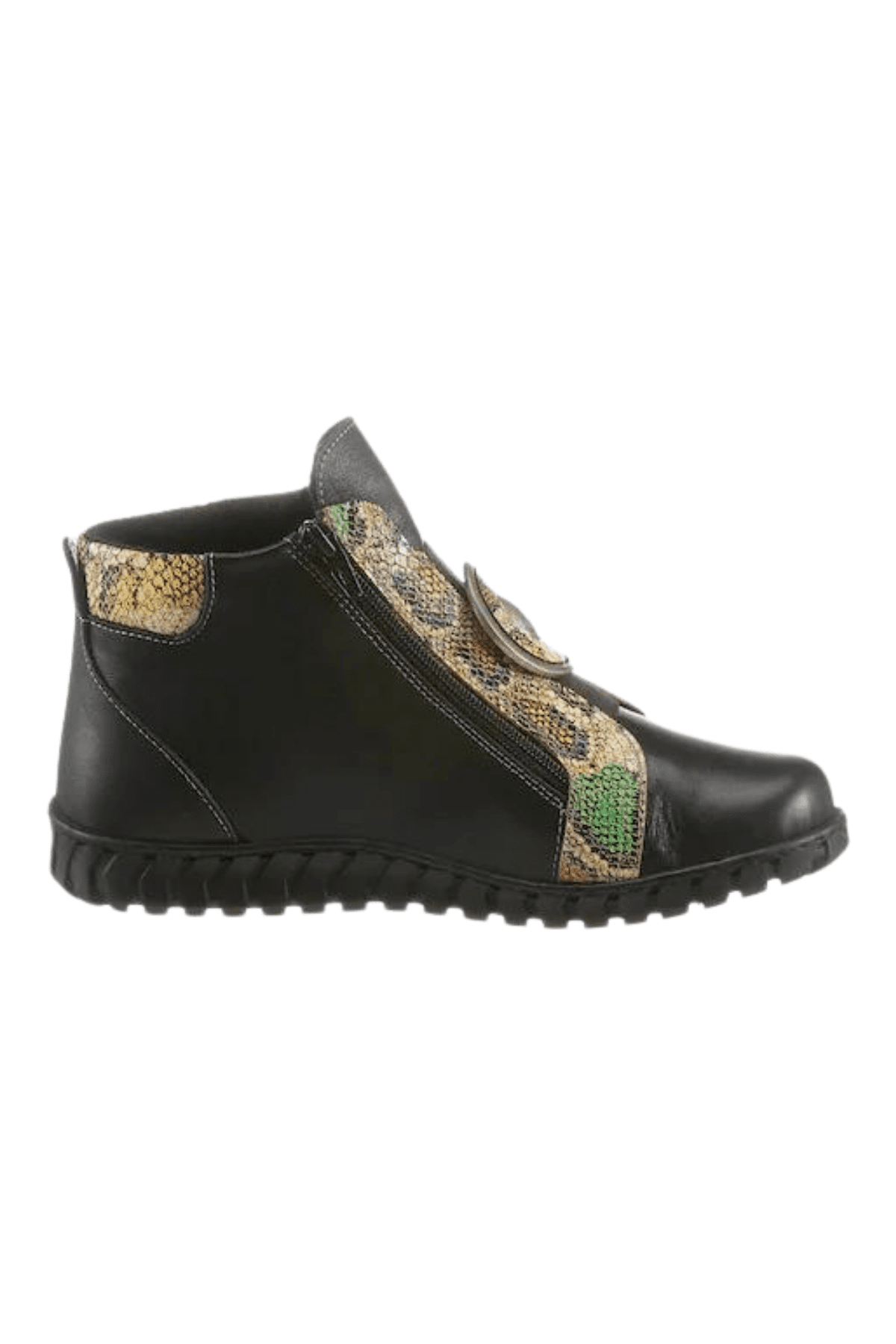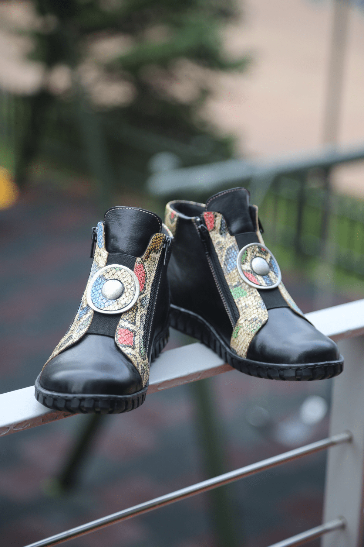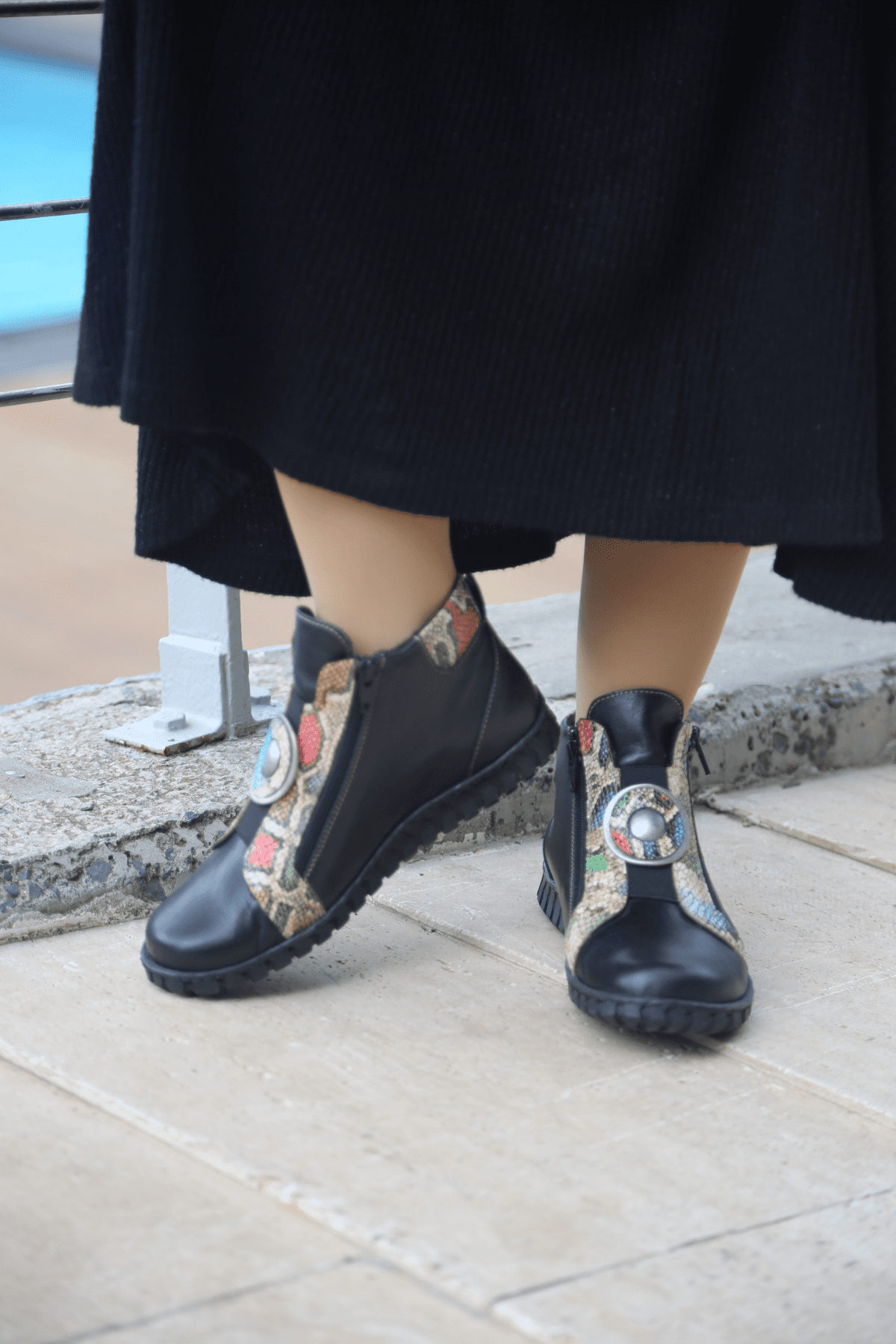 Hakiki deri bot, yılan deri desen detaylı, madalyon tokalı,çift taraf yan fermuarlı, ön lastikli, kauçuk taban, çıkarılabilir microfiber lateks fuspet