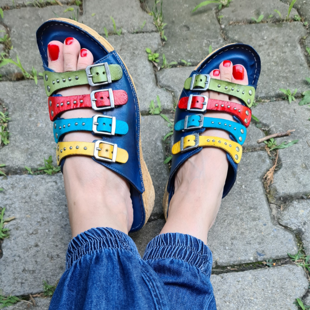 DÖRT TOKALI, TROKLU, ÇOK RENKLİ, POLİÜRETAN MANTAR TABAN, DOLGU TOPUKLU, İÇ DIŞ HAKİKİ DERİ