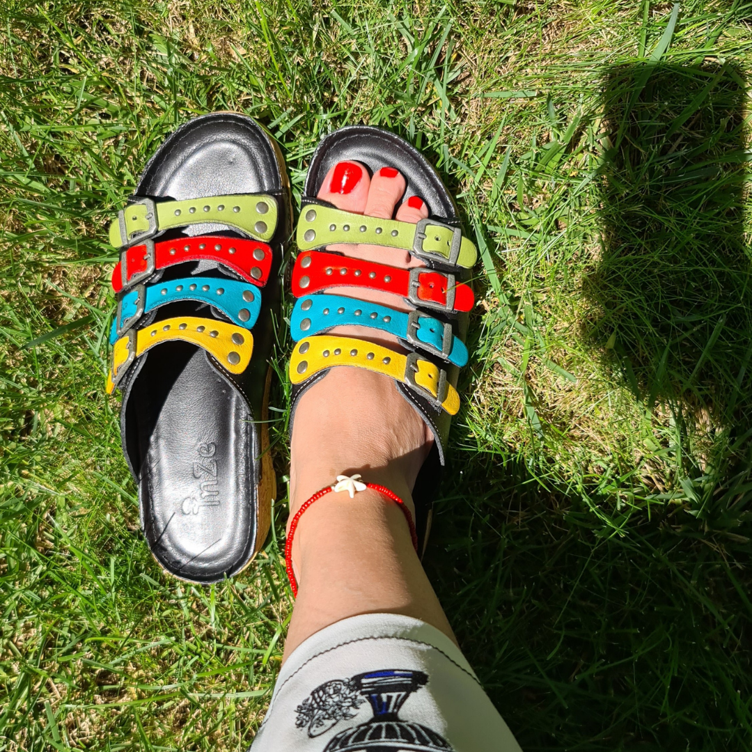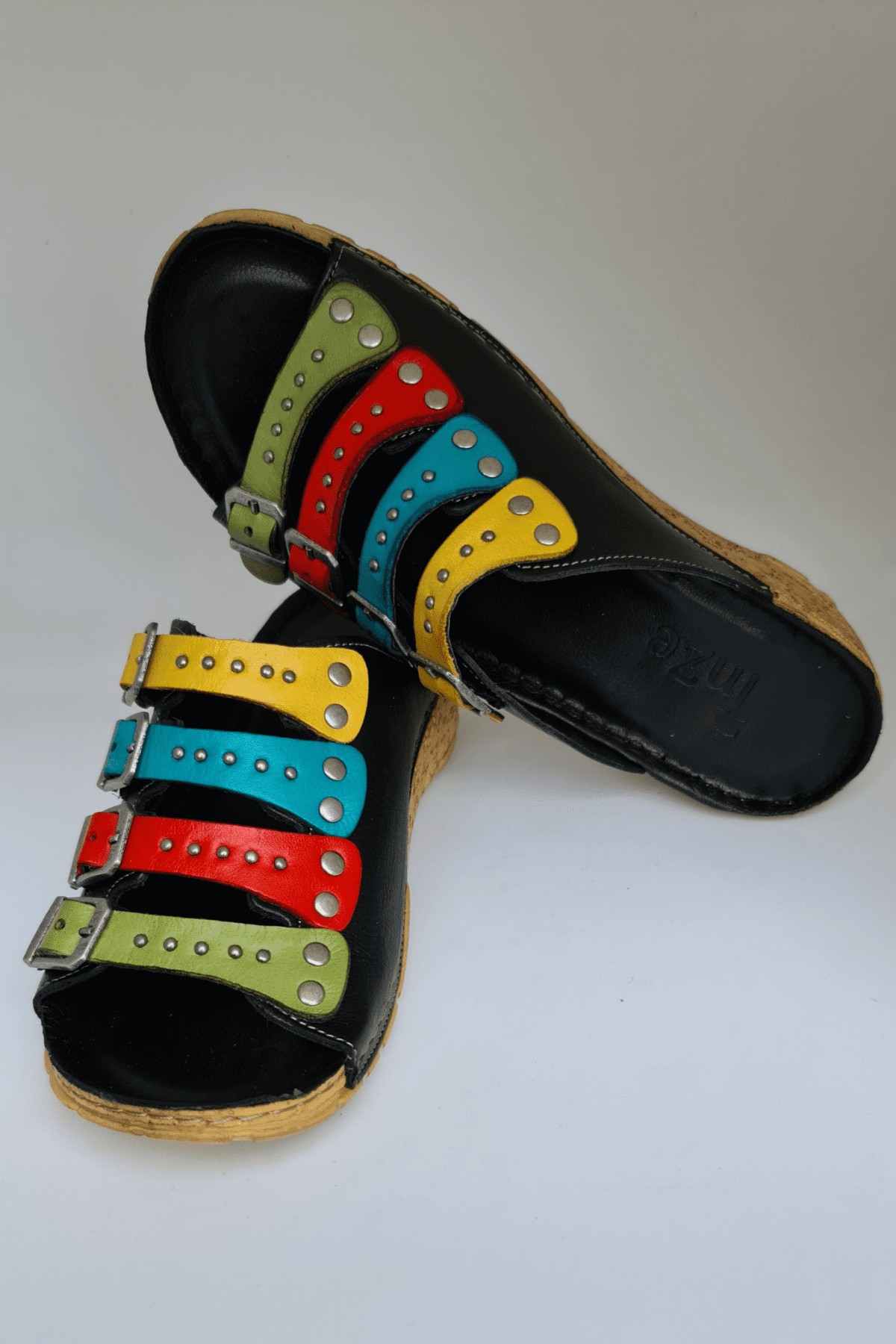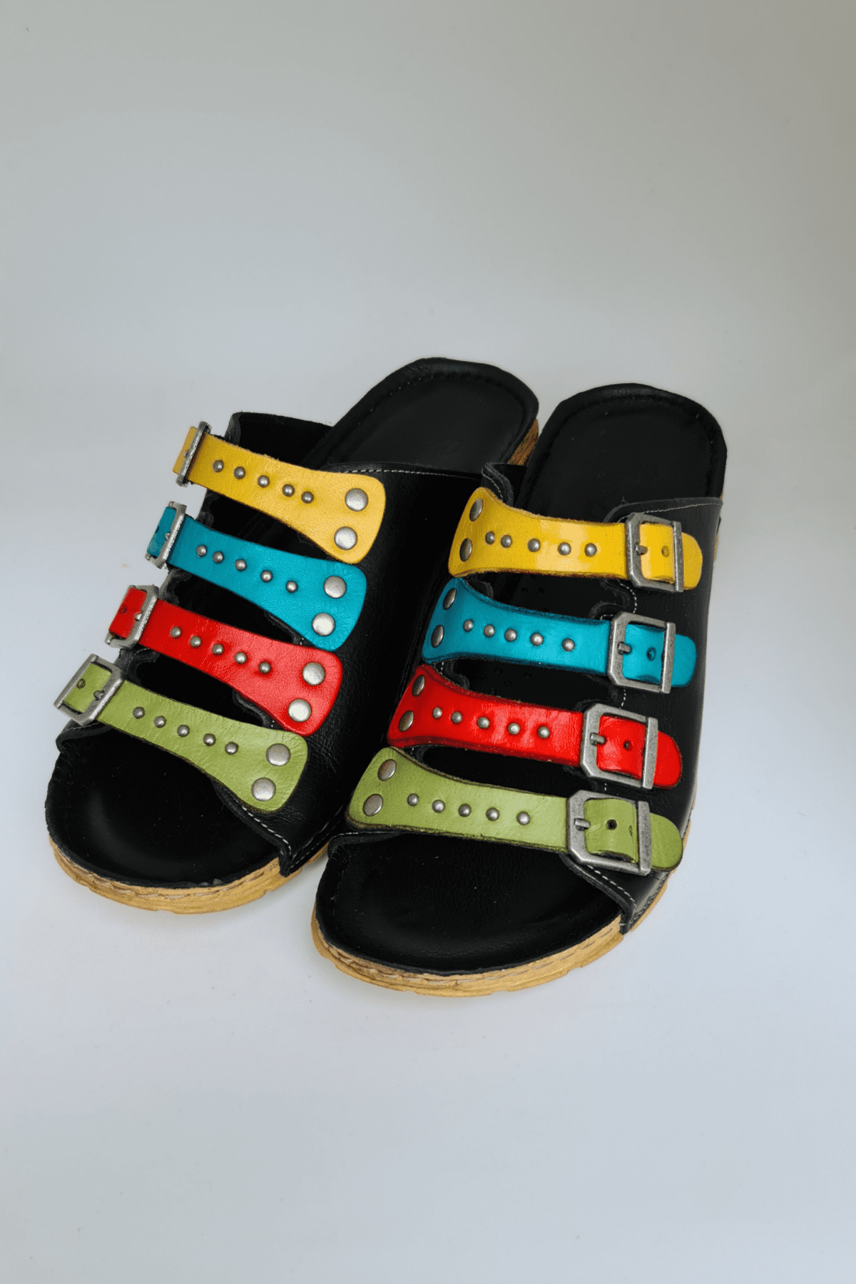 DÖRT TOKALI, TROKLU, ÇOK RENKLİ, POLİÜRETAN MANTAR TABAN, DOLGU TOPUKLU, İÇ DIŞ HAKİKİ DERİ