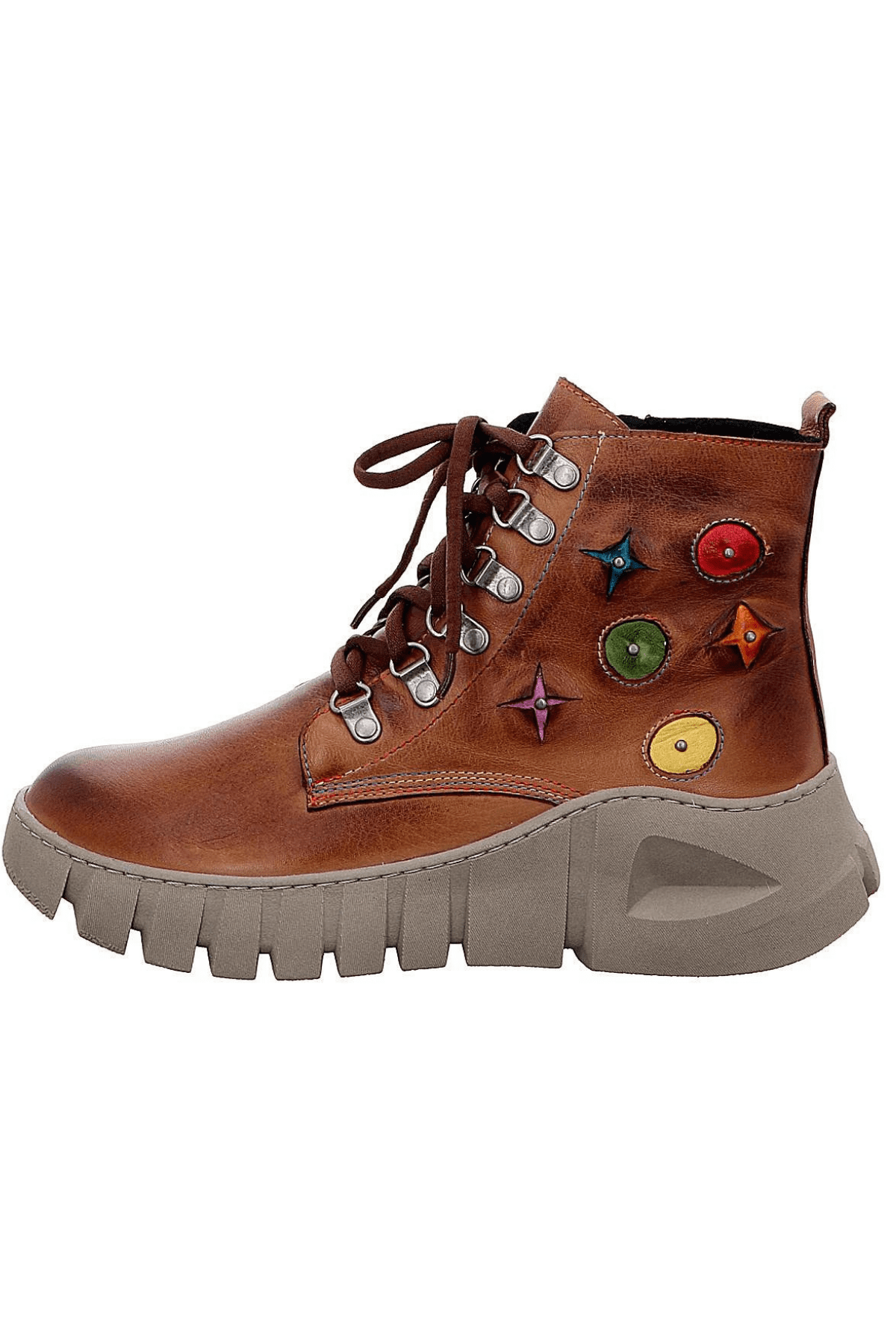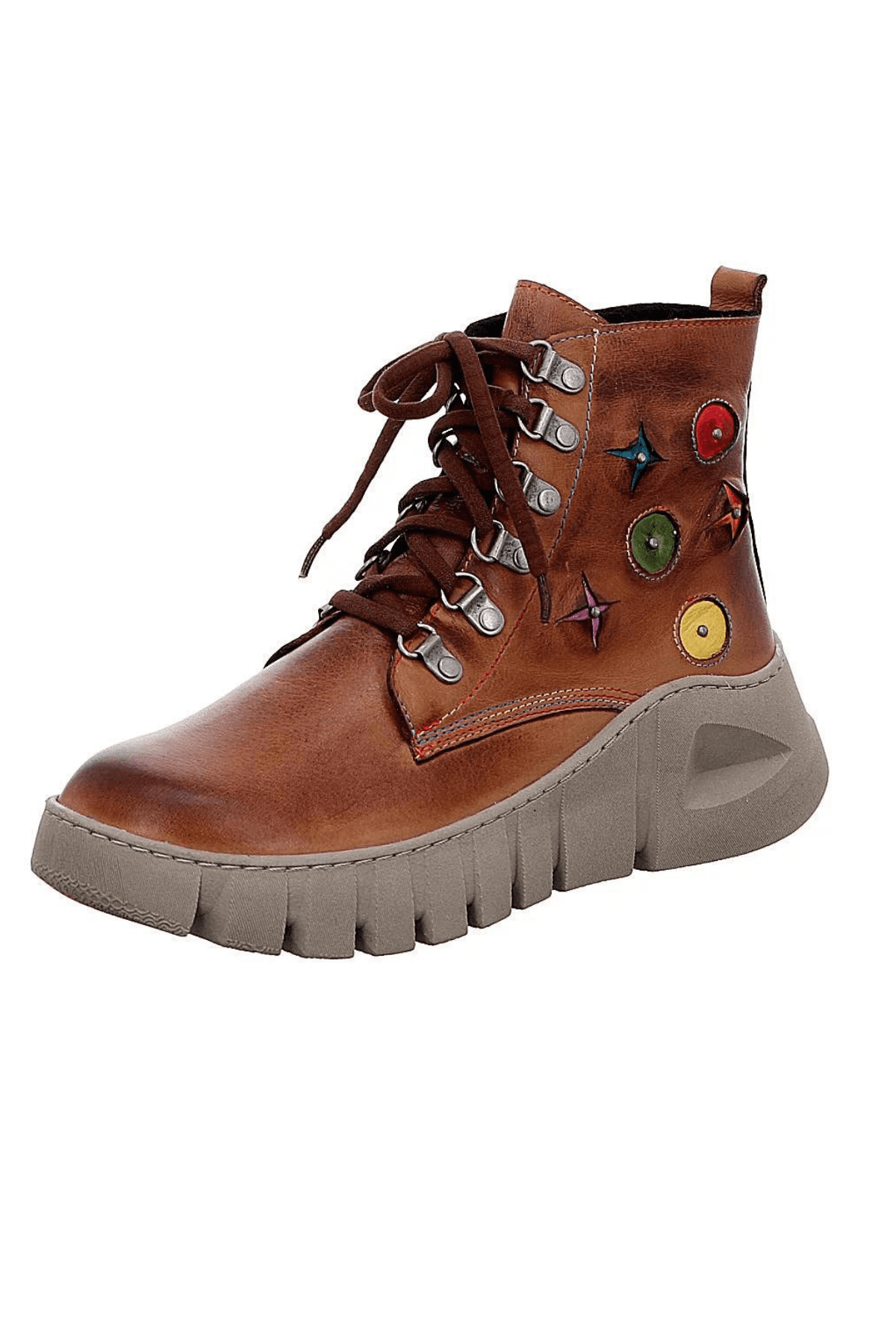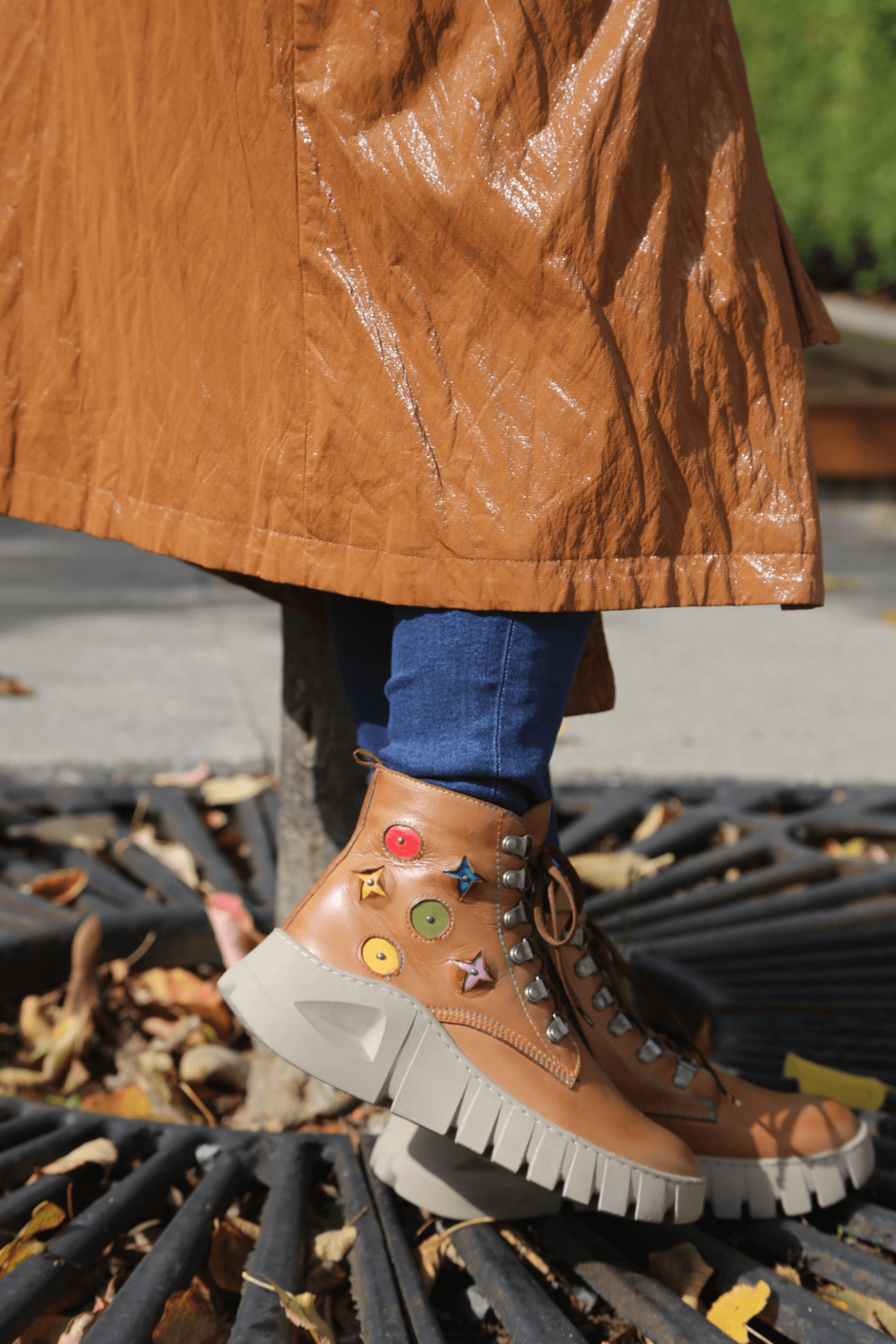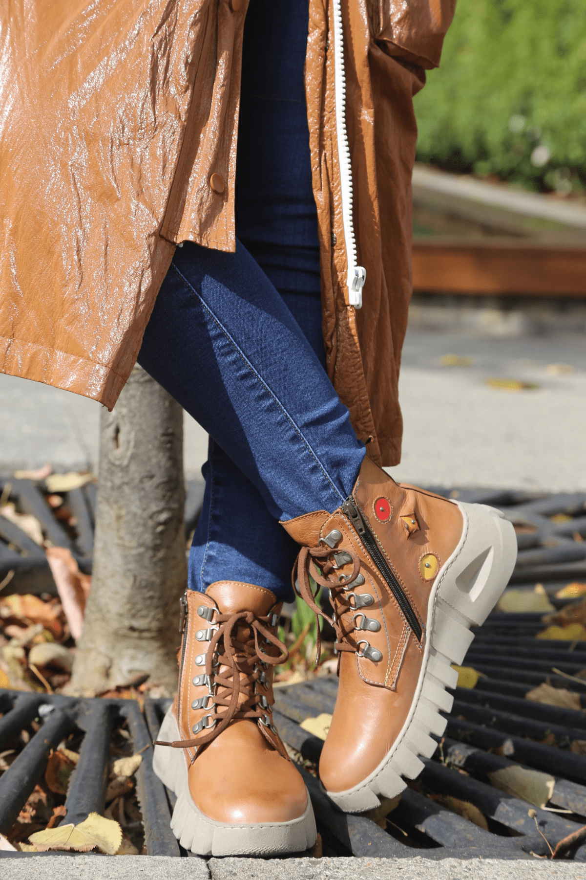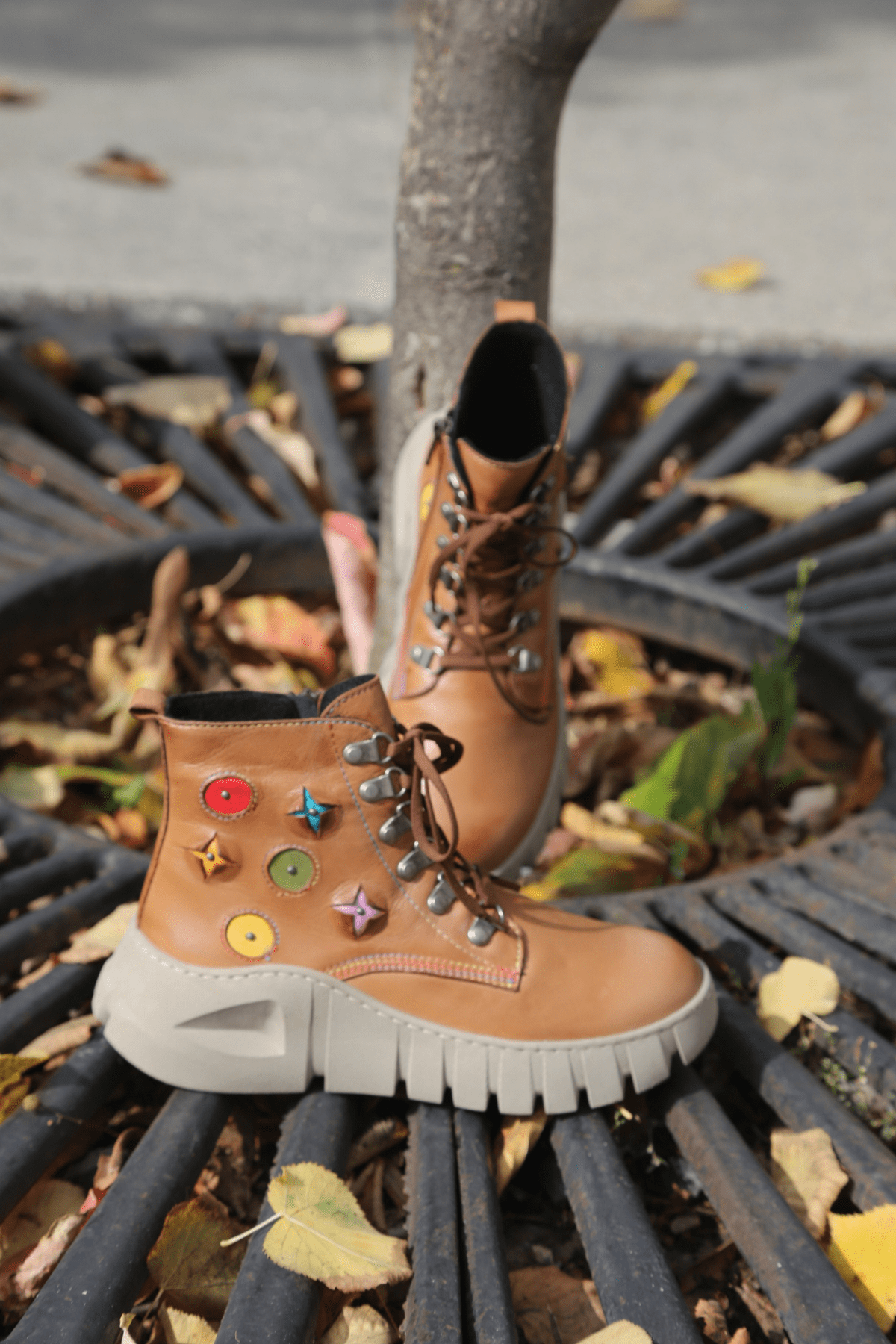 Hakiki deri bot, lastik bağcıklı, yan fermuarlı, renkli dekor detaylı, light termo taban, çıkarılabilir microfiber lateks fuspet