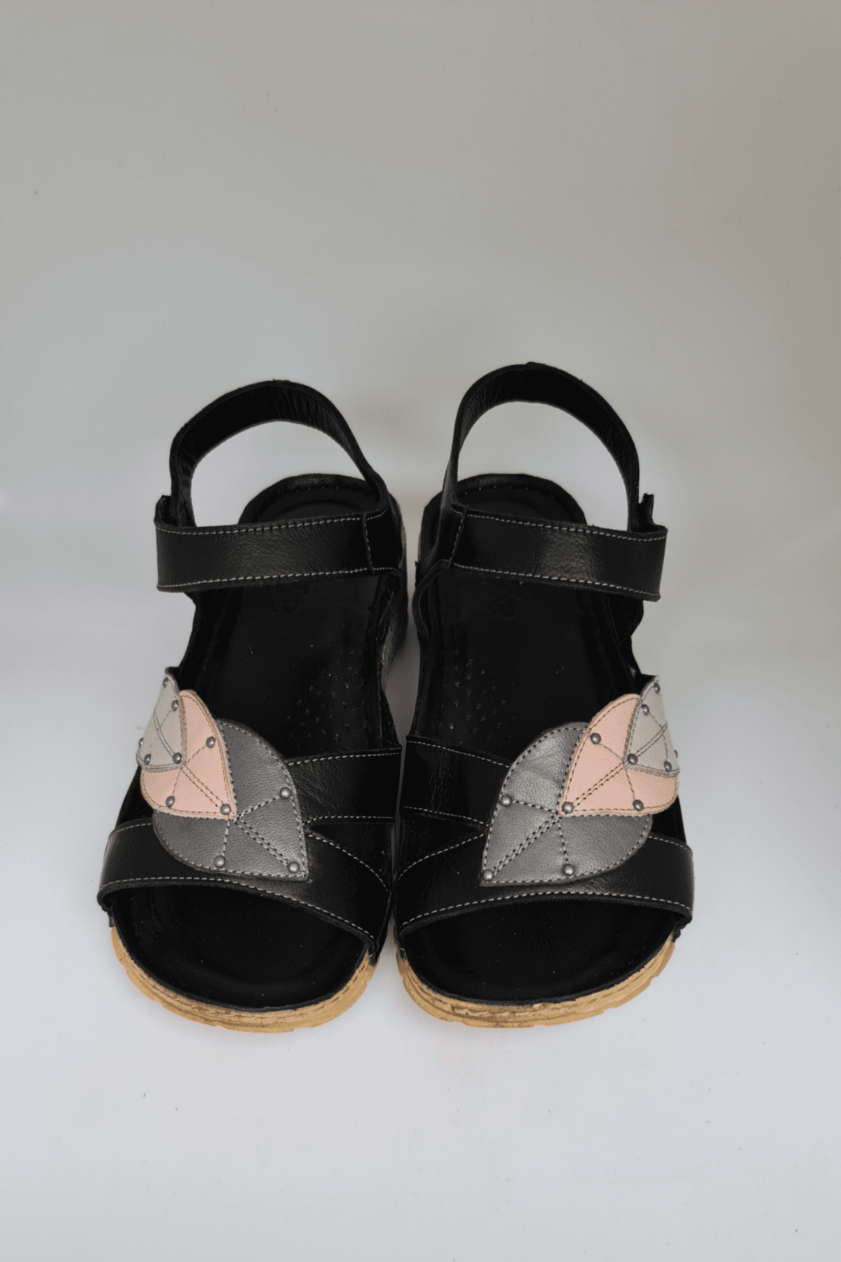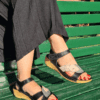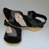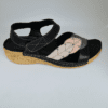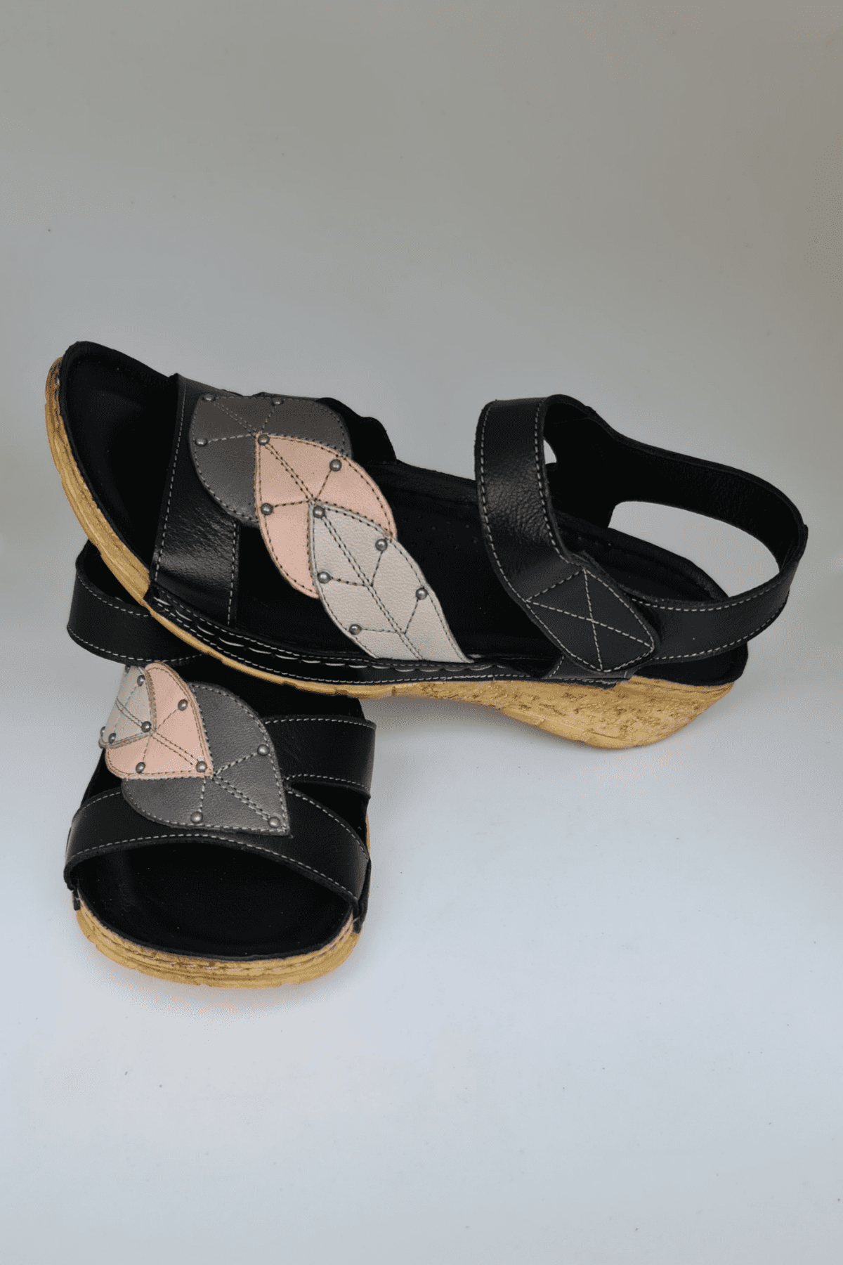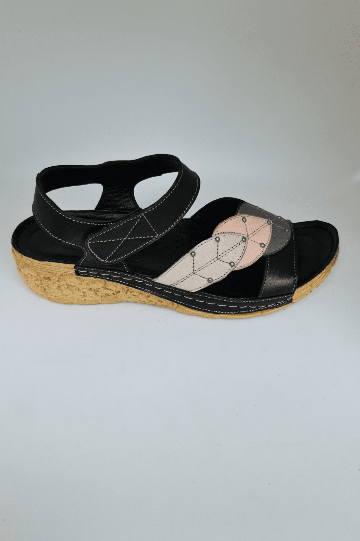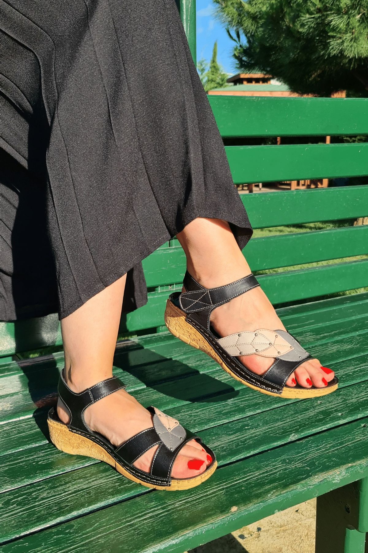 ÇOK BANTLI, İÇ DIŞ HAKİKİ DERİ, ARKA AYARLANABİLİR TOKALI,DESENLİ POLİÜRETAN MANTAR TABAN, DOLGU TOPUK.